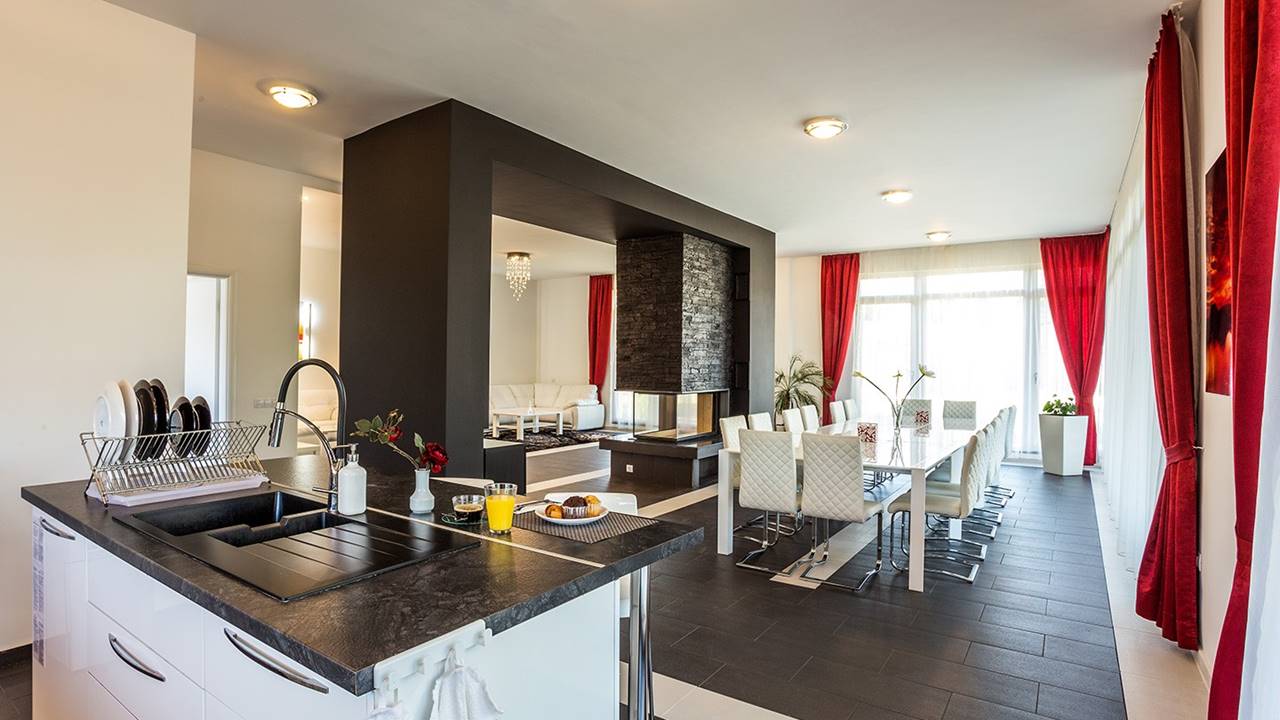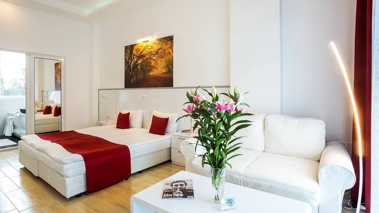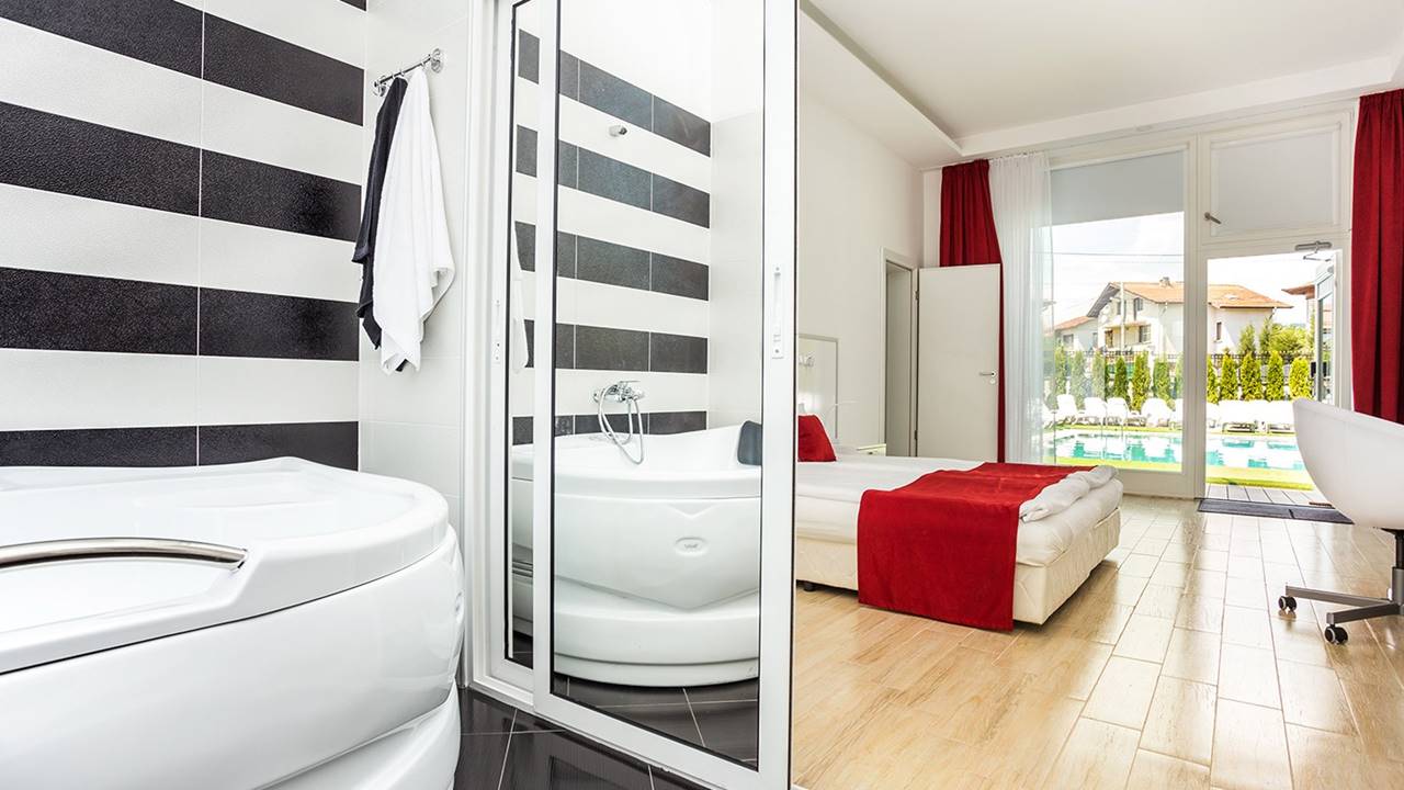 - Всички помещения са луксозно обзаведени и и разполагат с електронно заключване, подово отопление, плоскоекранен телевизор със сателитни канали и високоскоростна безжична интернет връзка, единична хидромасажна вана в банята