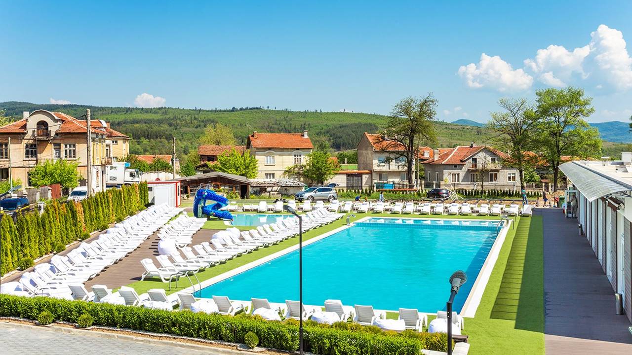 - Откритият минерален басейн (сезонен) е с дълбочина до 1,8 м и размери: 25 м дължина и 10 м ширина. Температура на водата, вливаща се в басейна – 67,8 °C. Подходящ е за плуване и игри с топка. Около него са подредени шезлонги и пуфове за общо 180 човека. За ваше удобство, в непосредствена близост има и съблекални, и външни душове.