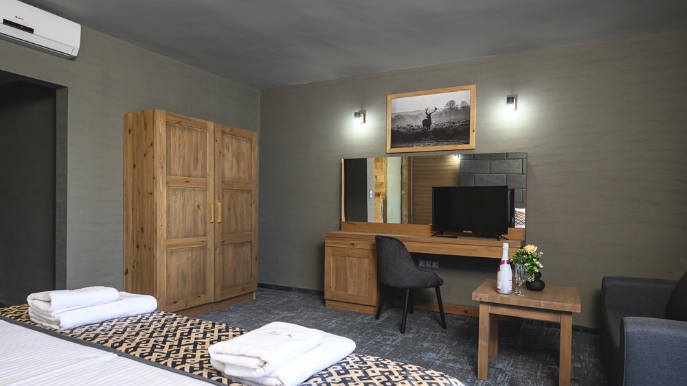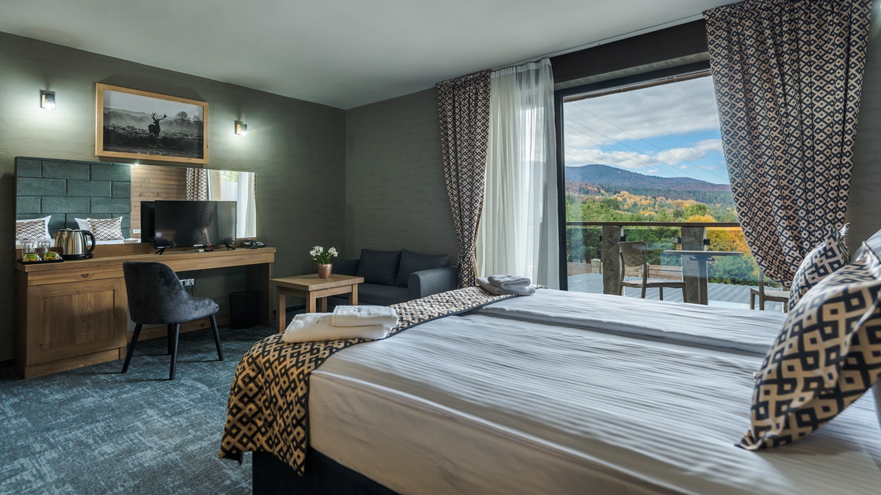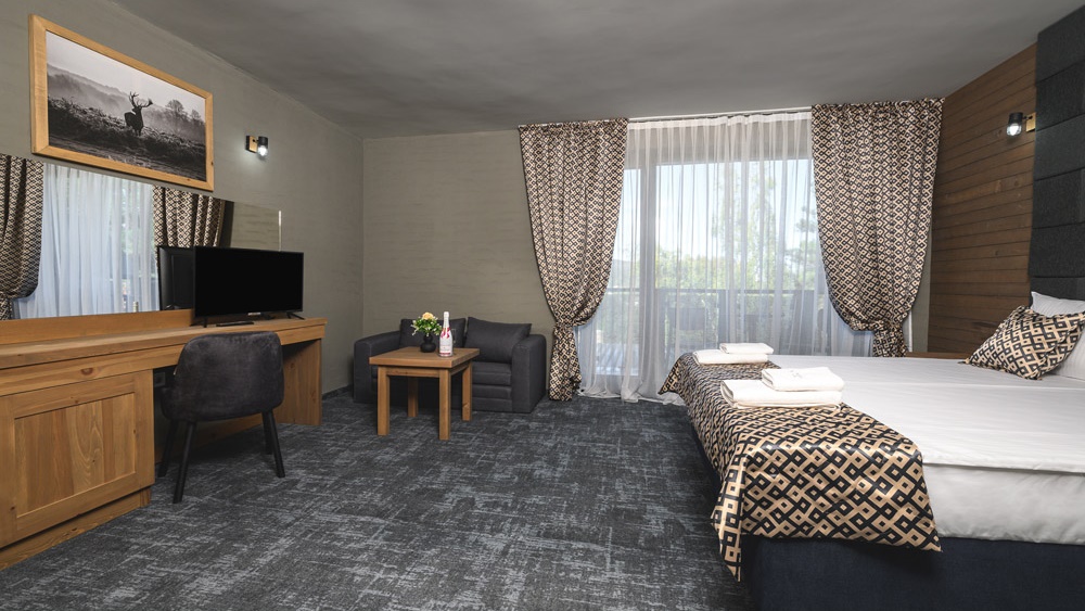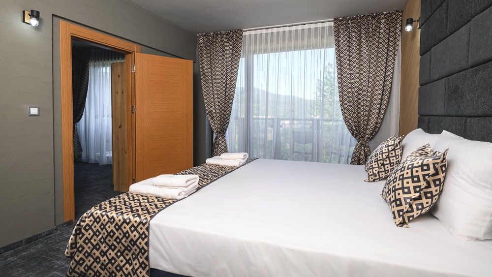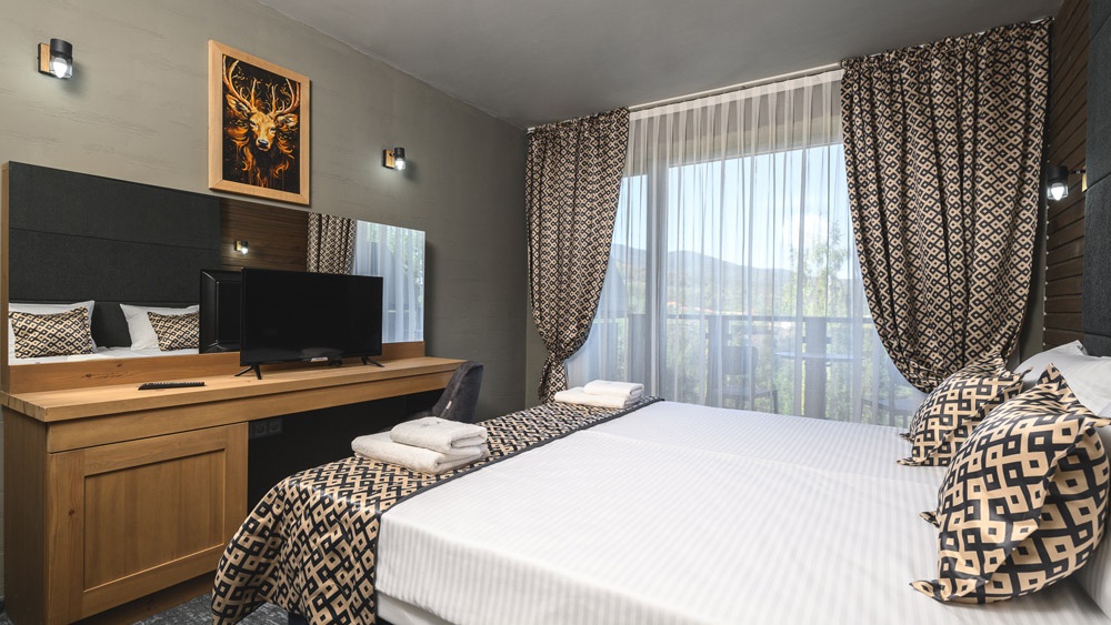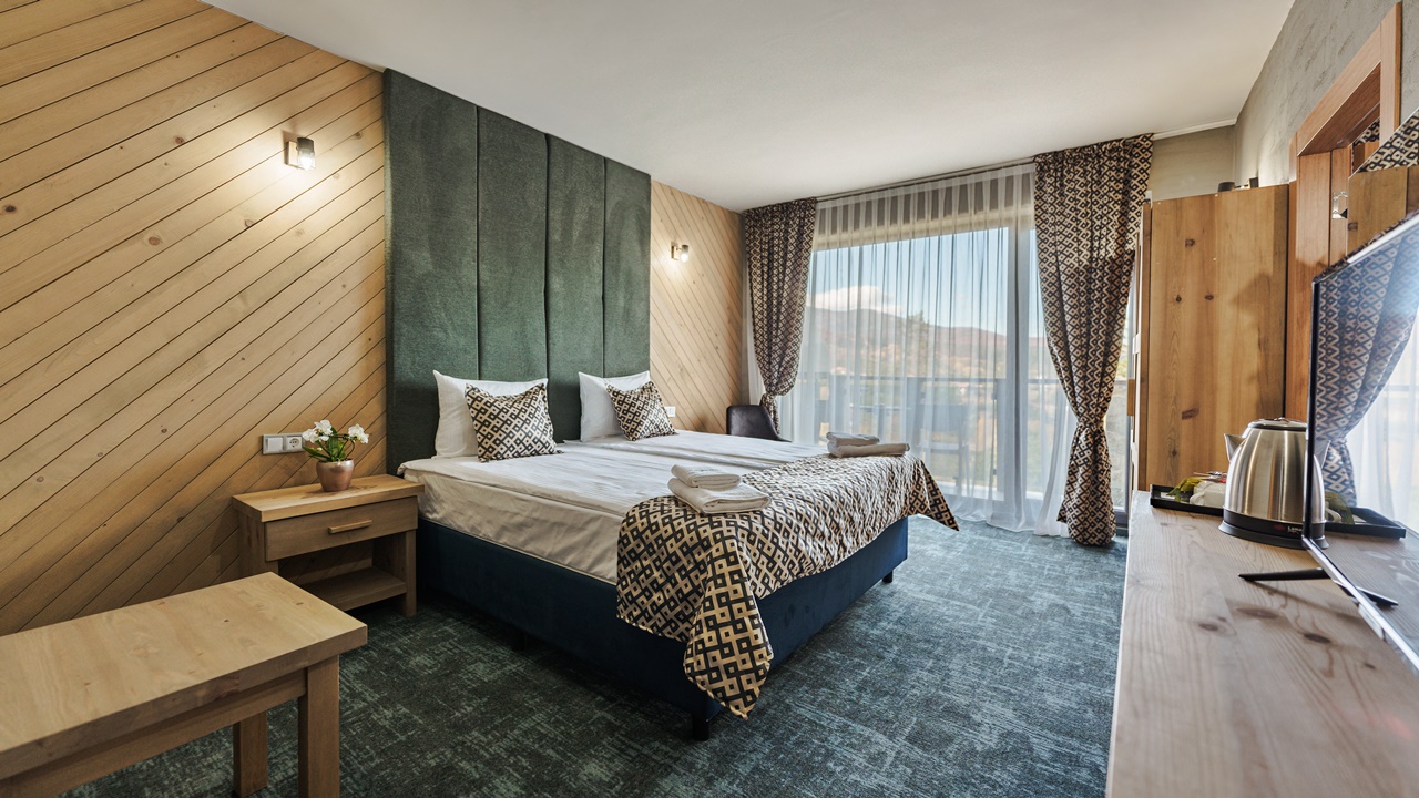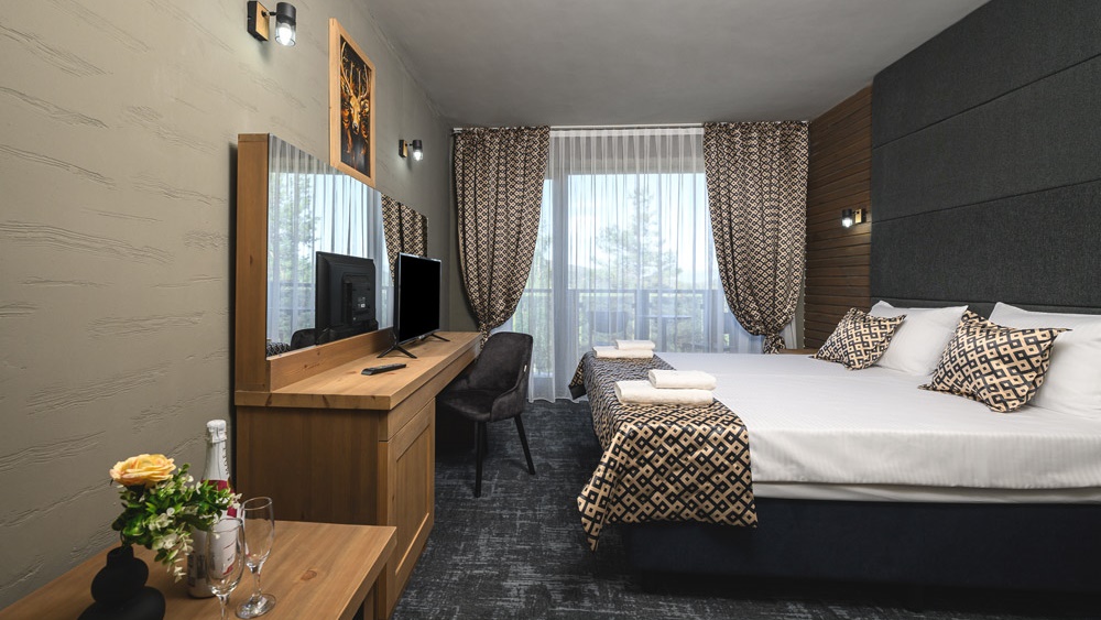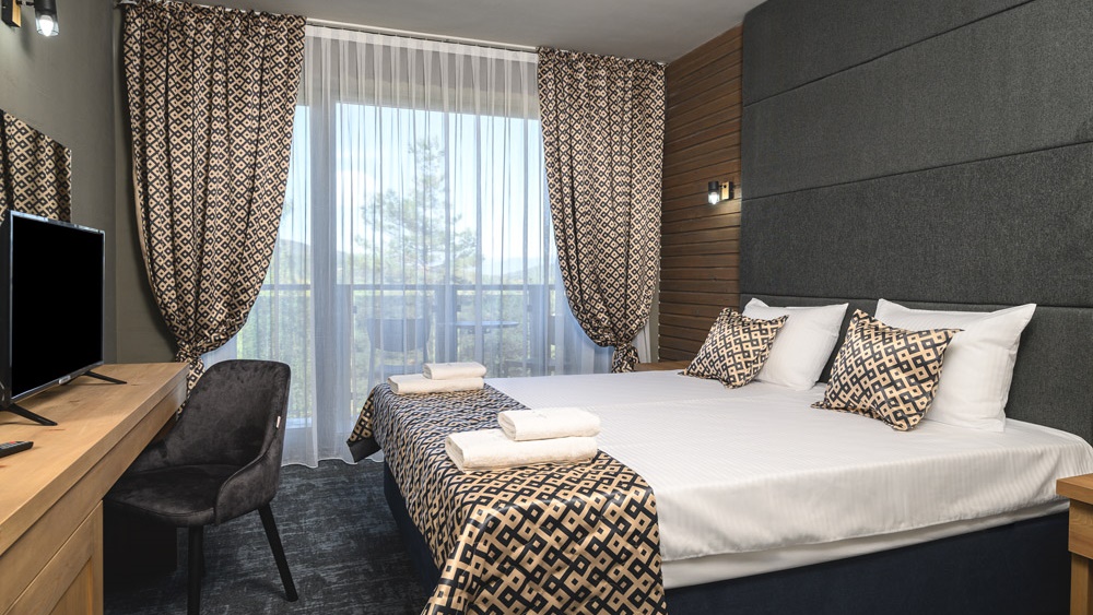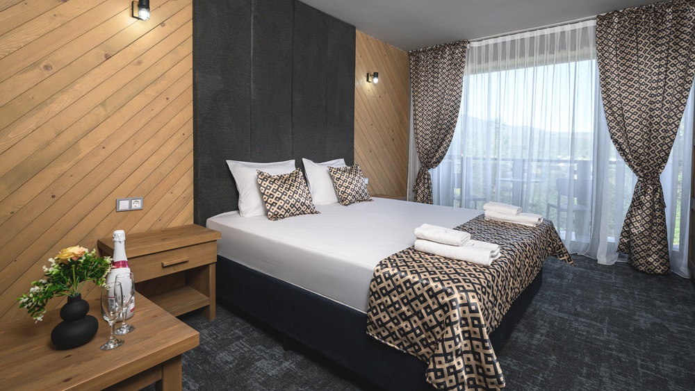 - двойна стая лукс (59 бр. в хотела) - Стаята разполага със спалня, баня с душ. Предвидена е за комфортния престой на двама възрастни. Съвършено балансирана комбинация от стил и комфорт. Тези стаи са проектирани, за да Ви предложат релаксиращо преживяване с модерно обзавеждане, удобни легла и очарователни гледки към природата. Всяка стая е оборудвана с всичко необходимо за пълноценен отдих, като предоставя идеално място за почивка след дълъг ден.