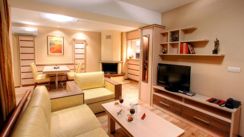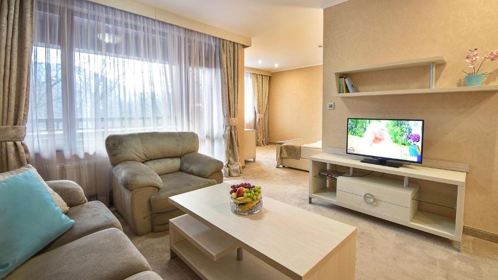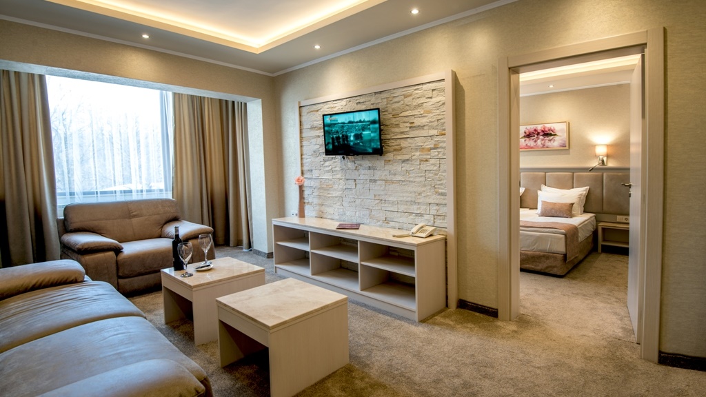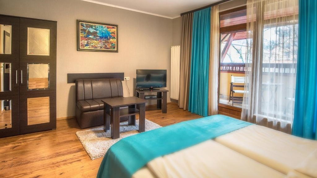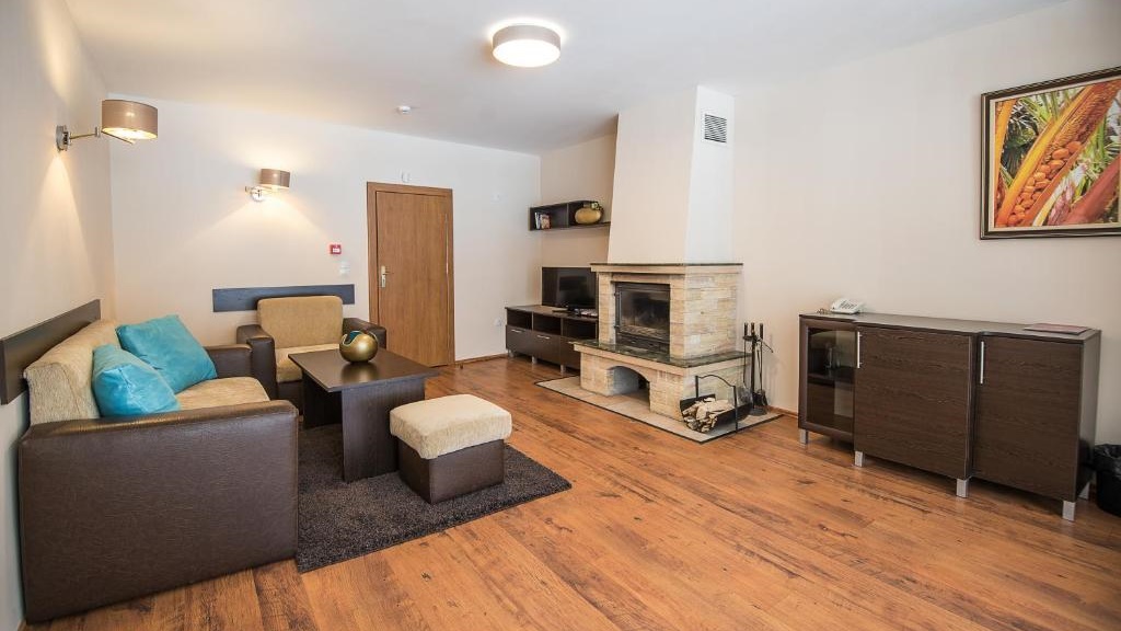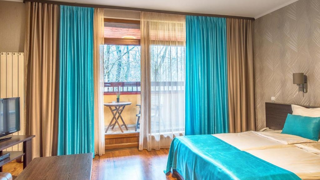 - Всички помещения се отличават с елегантно обзавеждане и модерно оборудване. Разполагат с LCD телевизор с IP телевизия, безжичен Интернет, климатик, просторна озвучена баня с душ кабина или вана и сешоар, минибар, тераса с гледка към гората