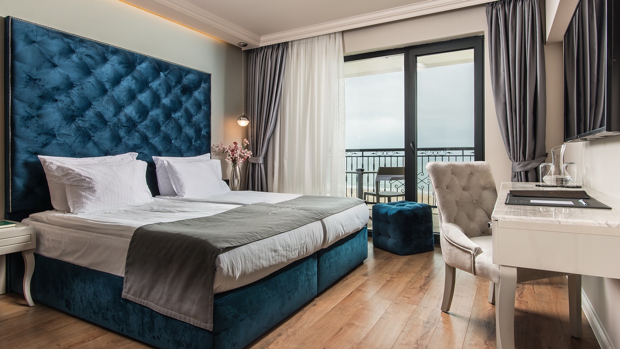 - 1 нощувка за 1 лице със закуска и вечеря в двойна стая Делукс със странична гледка Море (според избрания пакет)