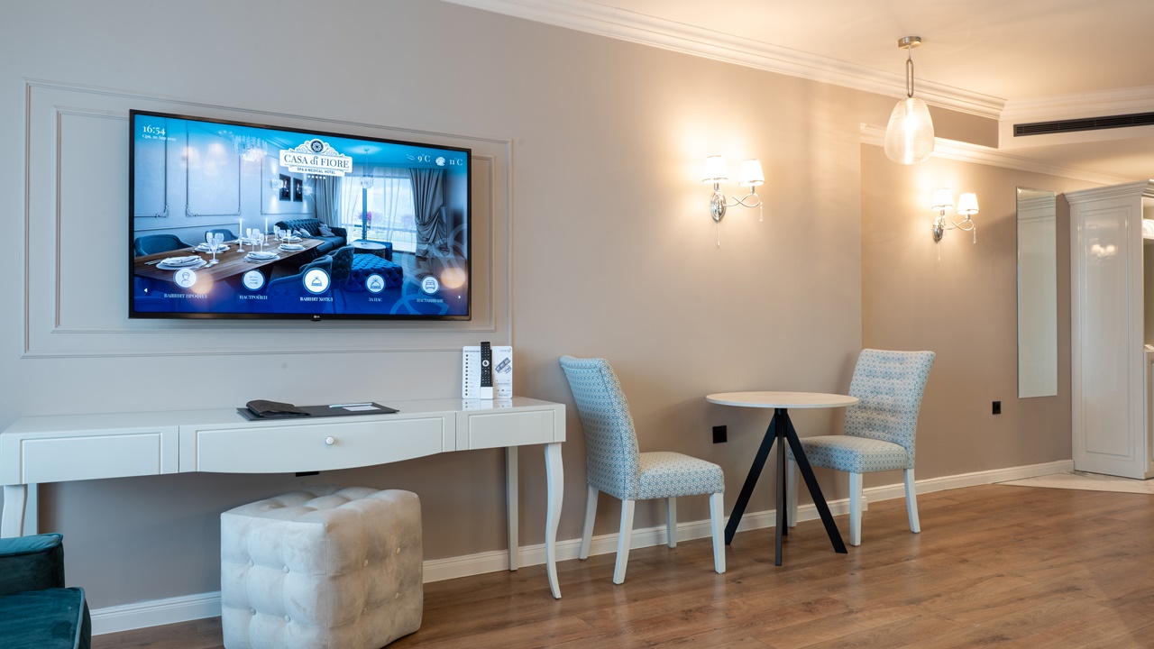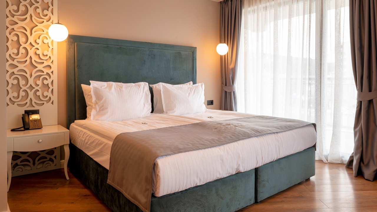 - Двойни стаи Делукс Магнолия и Лавандула: Голямо двойно легло с висококачествен матрак с размер 200 х 200, разтегателен диван с размер на матрака 153 х 182, 55-инчов смарт телевизор Интерактивна IPTV телевизия, климатизация, кафе машина и минибар /срещу заплащане/, сешоар, самостоятелна баня с душ кабина, тоалетни принадлежности, балкон (7 кв.м.) с маса и 2 стола