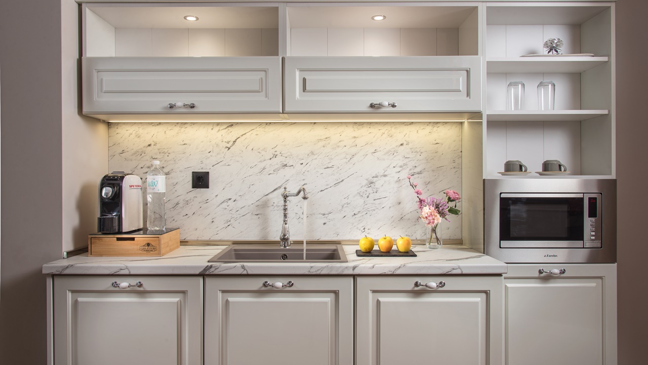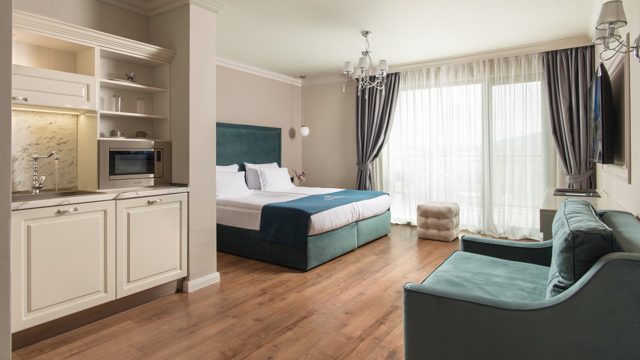 - Студио Жасмин: Голямо двойно легло с висококачествен матрак /200x200/, разтегателен фотьойл /матрак 80 х 182 /, кухненски бокс, трапезна маса за хранене, 55-инчов смарт телевизор, интерактивна IPTV телевизия, климатизация, кафемашина, сешоар, самостоятелна баня с душ кабина, тераса (8 кв.м.) с маса и 2 стола