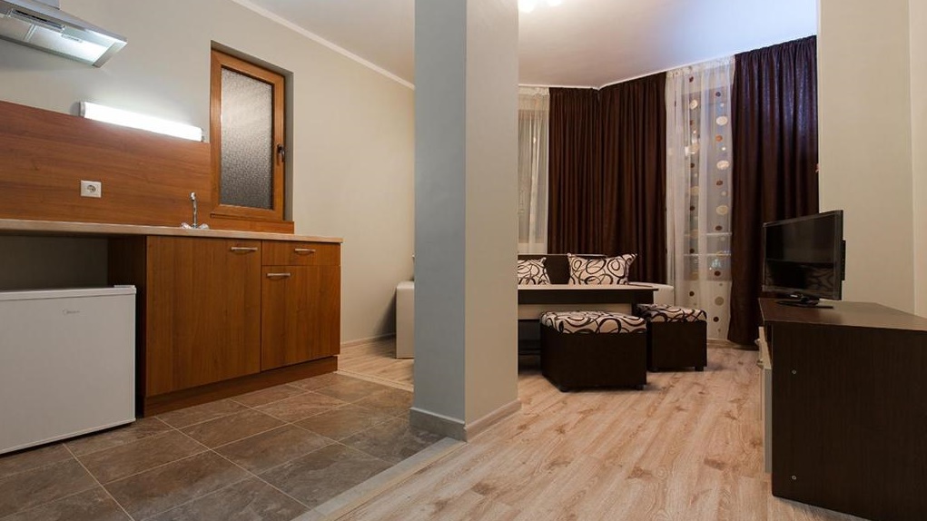 - Описание на апартаментите - хотелът разполага с 10 апартамента. Всичките са с тераси, климатици, интернет, телевизори, малки хладилници, кърпи и халати на разположение. Два от апартаментите са с 3 легла в спалнята и в хола има разтегателен диван. Останалите 8 бр. са със спалня или две отделни легла + разтегателен диван в хола. Две помещения отделени с врата или коридор.