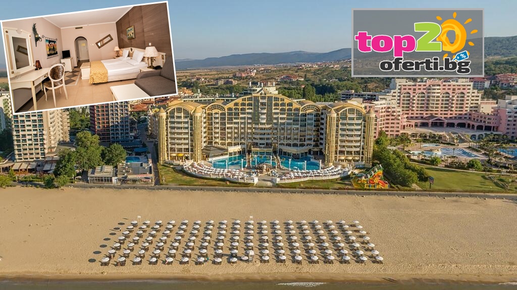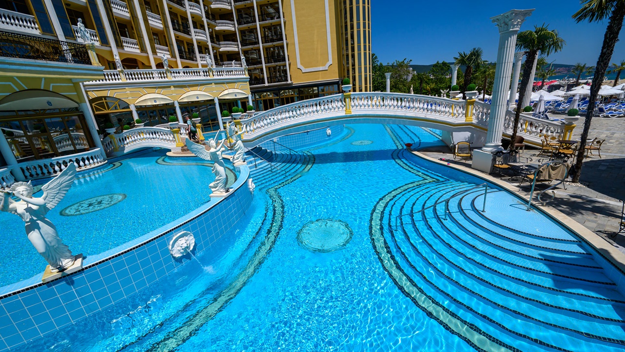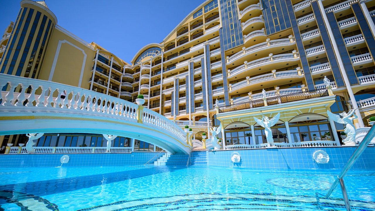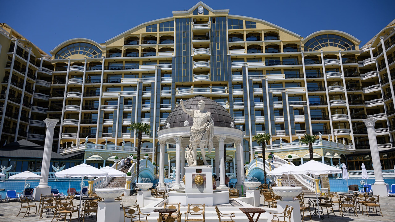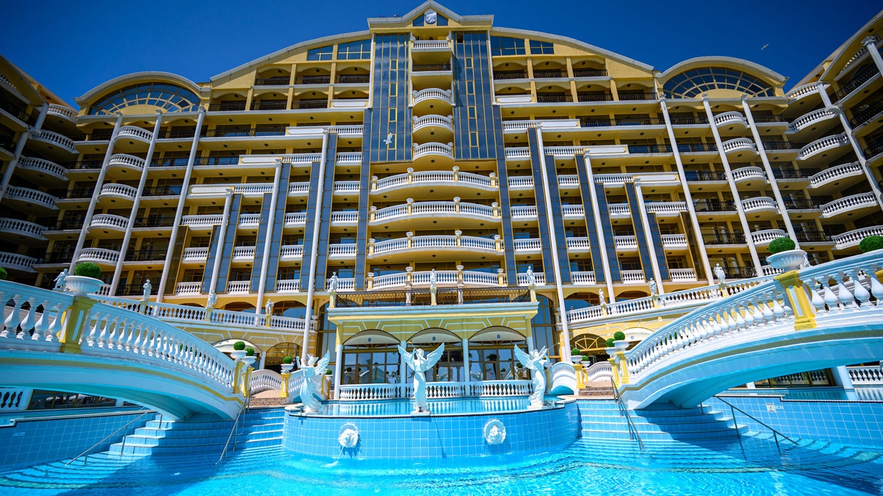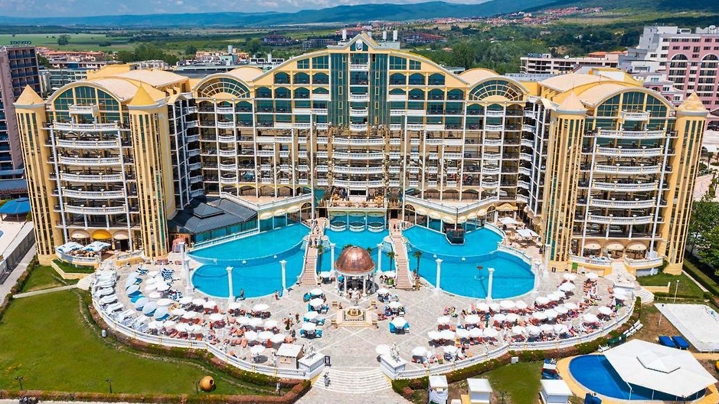 Потопете се в уникалната му атмосфера, подсилена от фин мрамор, масивни древни колони и ефектни полилеи. Насладете се на многобройните му огромни басейни и възхитителната палитра от спортни и разкрасителни процедури. Възползвайте се от удобството и спокойствието на неговите 550 хотелските стаи и студиа с великолепни гледки към залива на Слънчев бряг и стария Несебър. Отдайте на вкусни ястия, приготвени от имперска армия кулинарни професионалисти и сервирани сред красота и елегантност в ресторанта и петте бара на хотела.