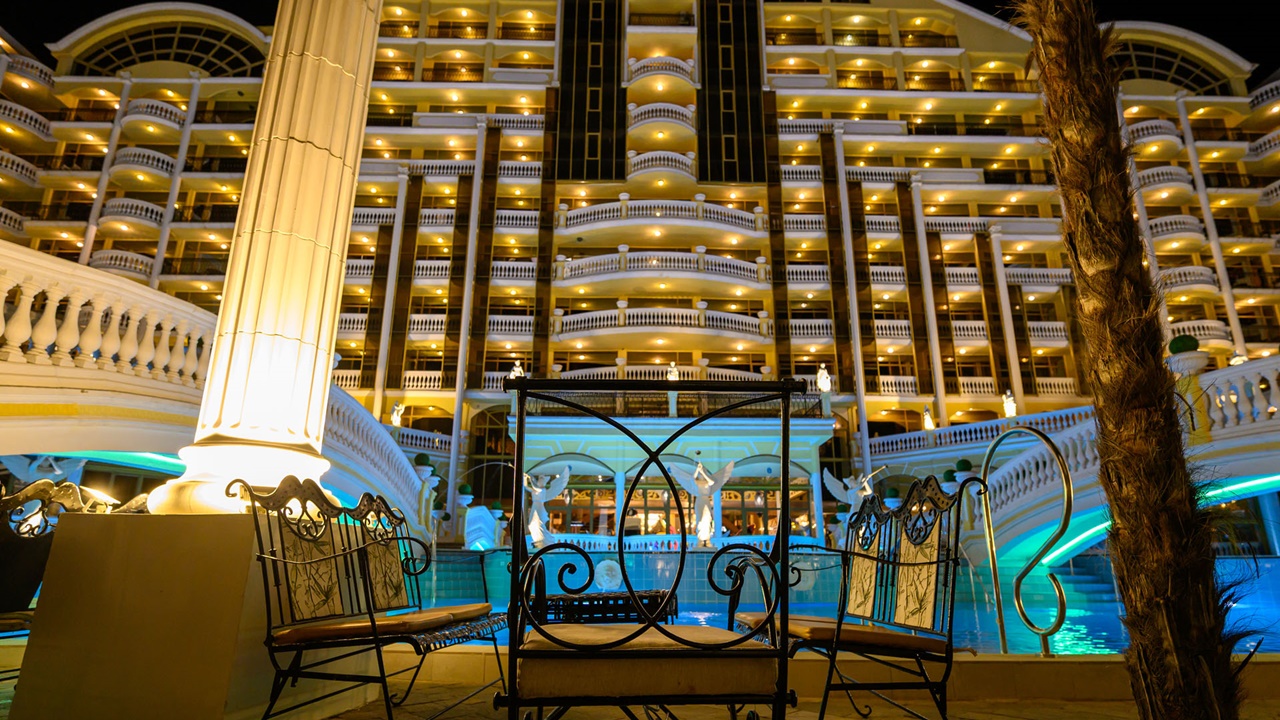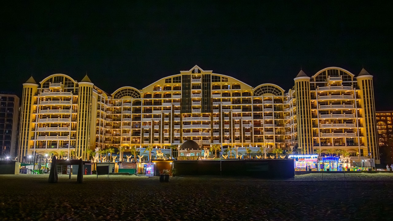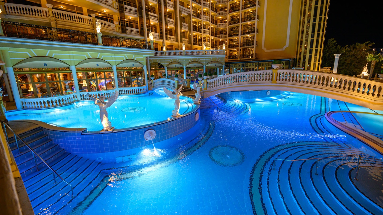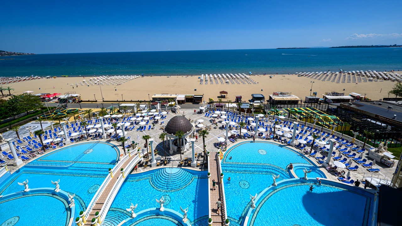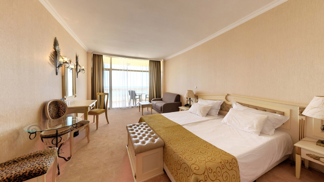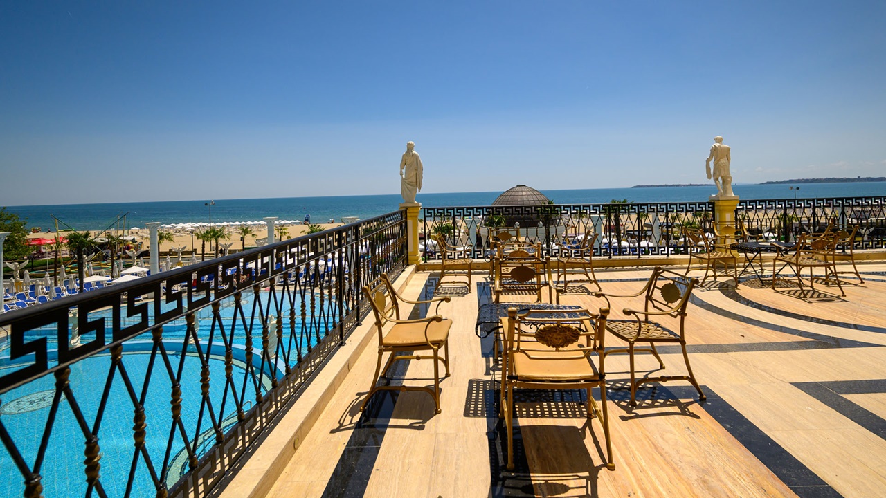 Потопете се в уникалната му атмосфера, подсилена от фин мрамор, масивни древни колони и ефектни полилеи. Насладете се на многобройните му огромни басейни и възхитителната палитра от спортни и разкрасителни процедури. Възползвайте се от удобството и спокойствието на неговите 550 хотелските стаи и студиа с великолепни гледки към залива на Слънчев бряг и стария Несебър. Отдайте на вкусни ястия, приготвени от имперска армия кулинарни професионалисти и сервирани сред красота и елегантност в ресторанта и петте бара на хотела.