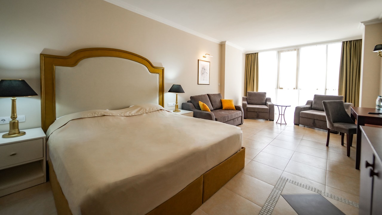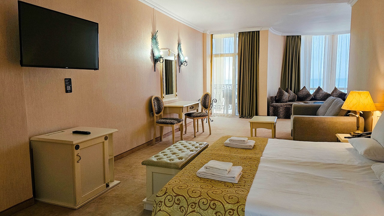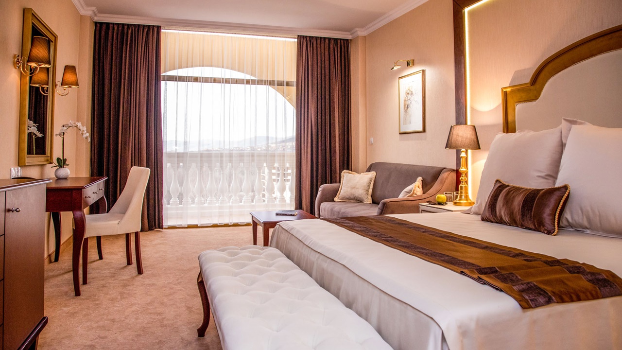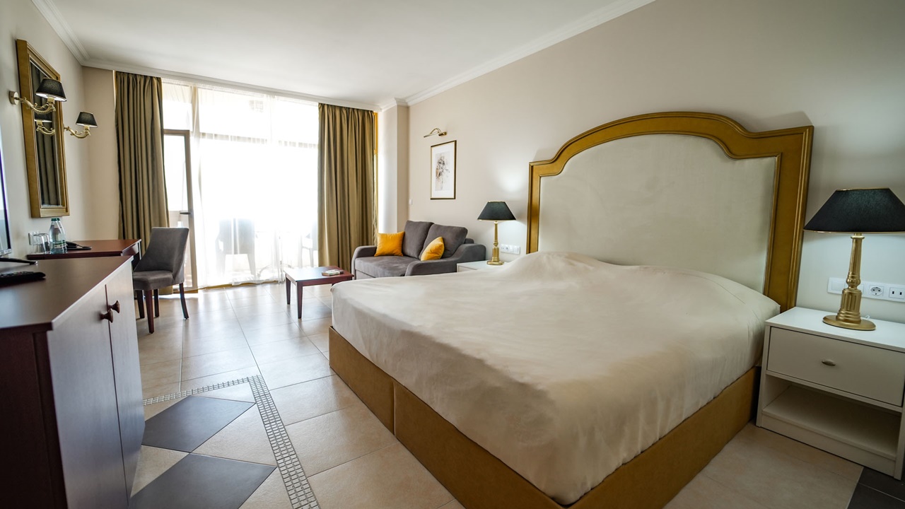 - супериорна двойна стая парк/ море - Шикозни и просторни, супериорните стаи са разположени на 8-я етаж и разкриват уникална палитра от прекрасни природни гледки във всички нюанси на синьото и зеленото. Стилен декор в цветовете на шоколад, карамел и канела, златни акценти, огромно луксозно легло, елегантни мебели в уютния кът за сядане и прекрасни цветни аранжировки ви приканват да изживеете повече.