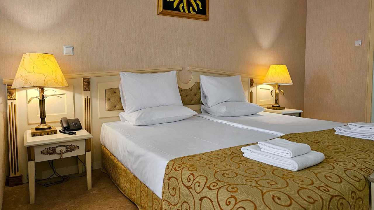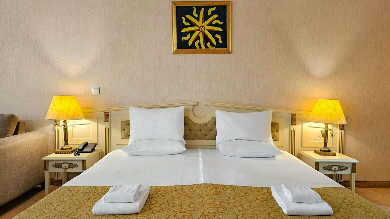 - двойна стая гледка парк/море - Стандартните стаи са с изискана класическа обстановка в меки цветове, допълнена от красиви картини и елементи на изкуството, създават атмосфера на удобство и удоволствие. 113 стандартни стаи с изглед към курорта и 242 стандартни стаи с изглед към морето