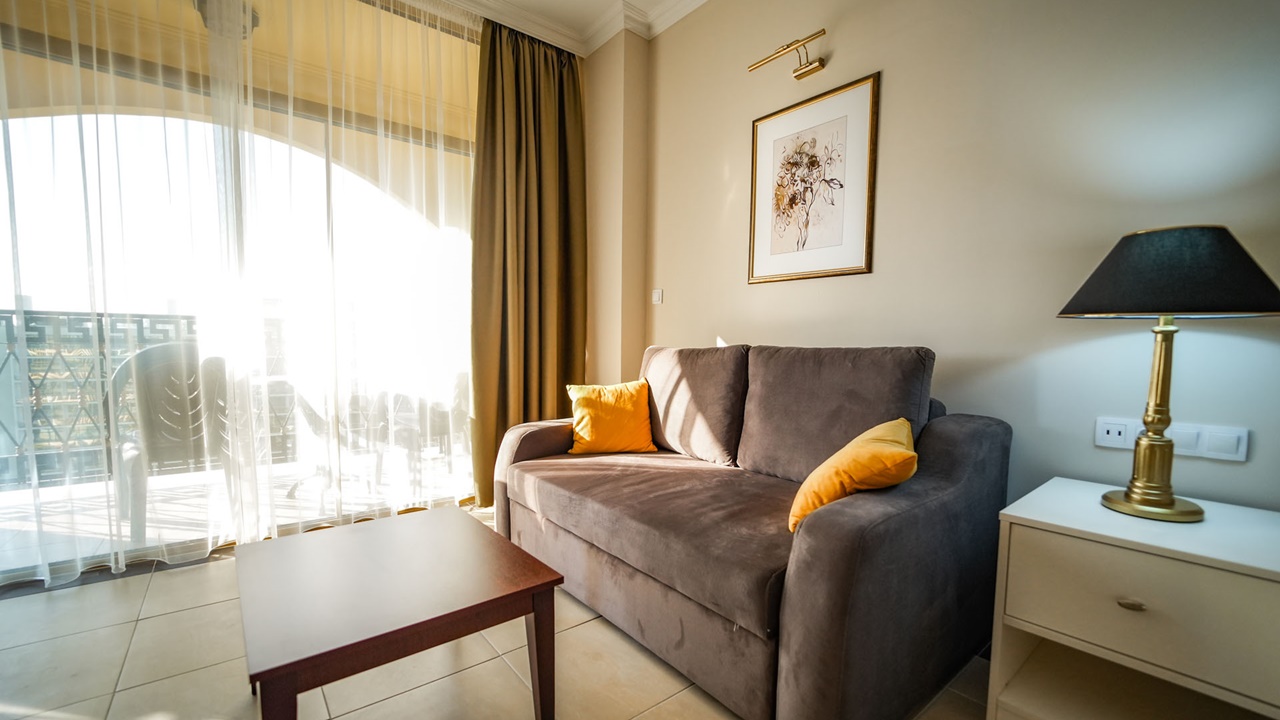 - студио море- Общата площ е 32 кв.м., а уютната зона за релакс е предпочитано място за семейни събирания и вълнуващи настолни игри. Голямата тераса предлага уникални възможности да се насладите на изгрева над стария Несебър или магията на залива на Слънчев бряг. На разположение са 42 студия с изглед море