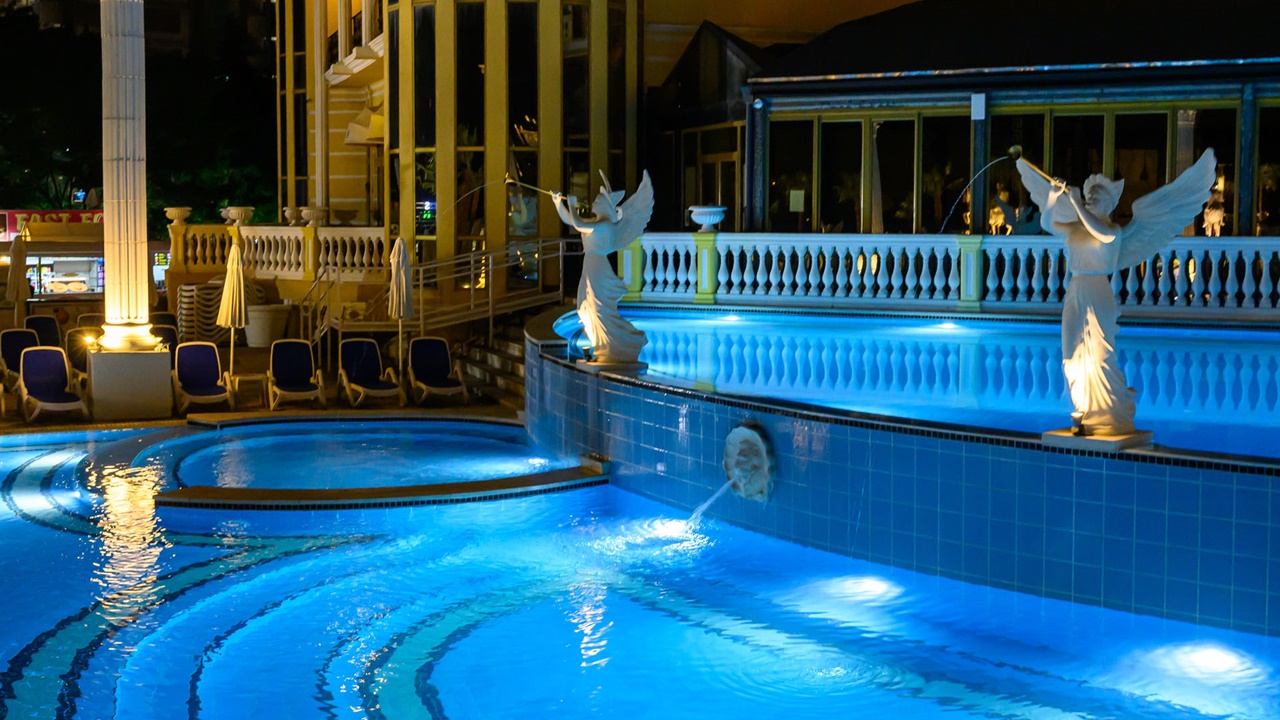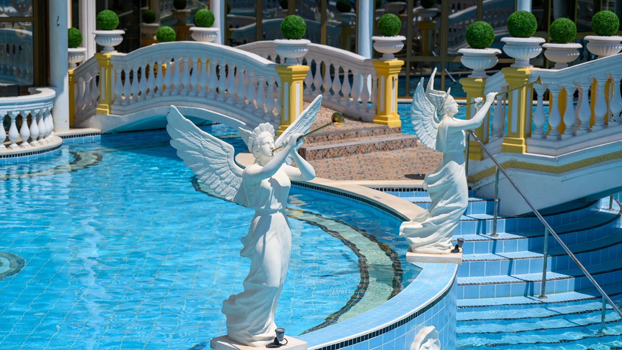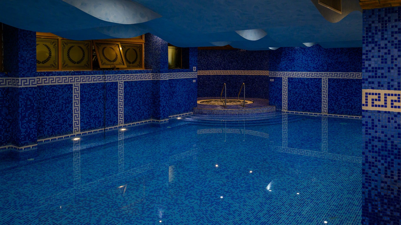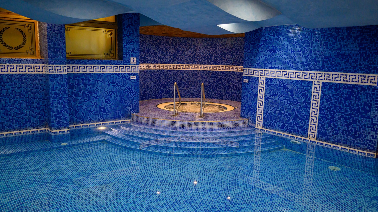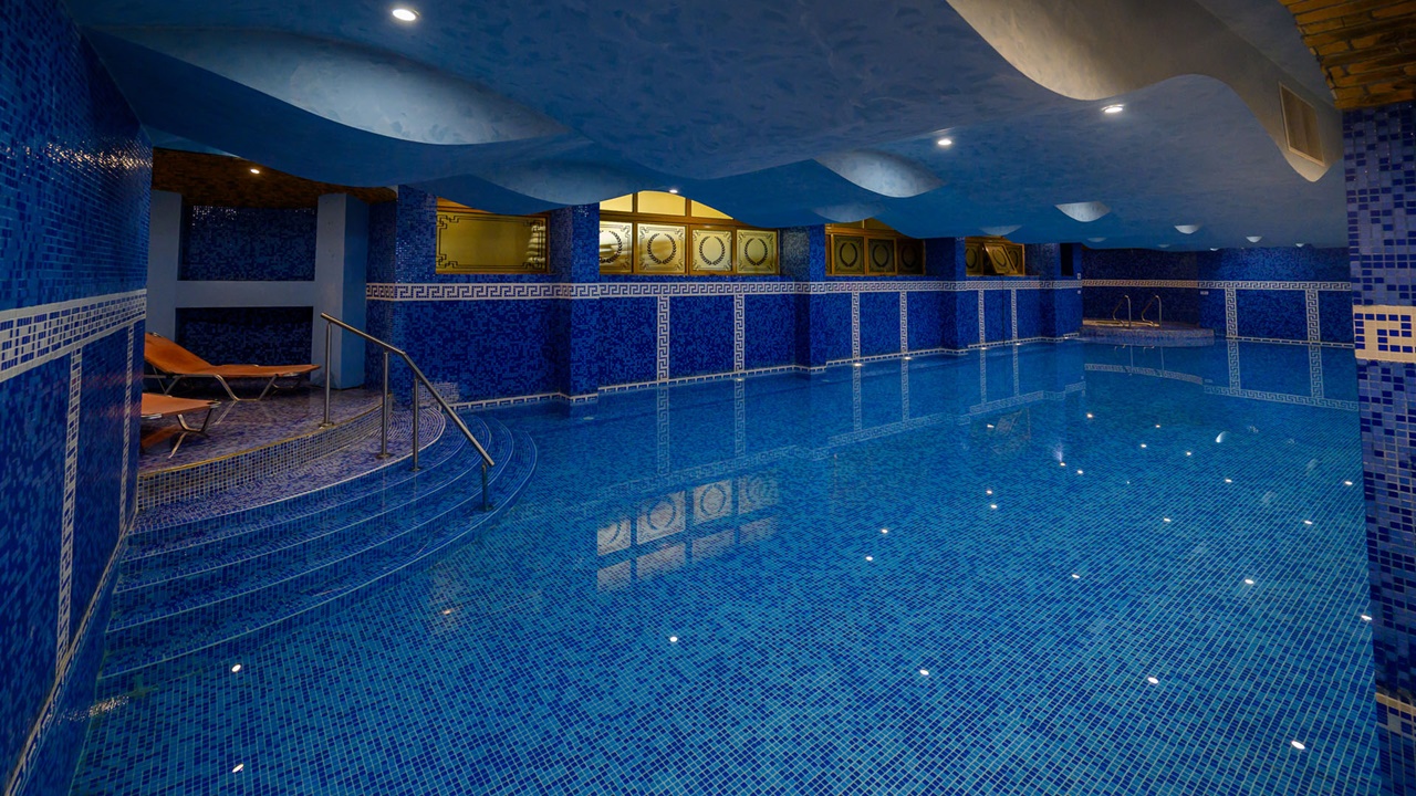 Вътрешният басейн на Империал Палас Хотел 4*, Слънчев бряг осигурява спокоен и качествен отдих при всякакво време. Приятната атмосфера се подсилва от сини тавани с формата на морски вълни, атрактивни каменни ниши в светли цветове като препратка към древните времена, и удобни зони за сядане. Разкошни акценти като прегради от бял мрамор и златисти стенни панели с лаврови венци се допълват хармонично, докато приглушеното осветление допринася за постигането на абсолютна релаксация и самовглъбяване. Дълбочината на басейна е 1,5 м, което го прави добър избор както за възрастни, така и за деца.