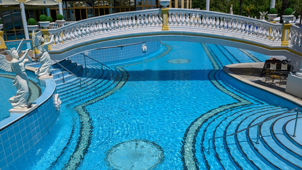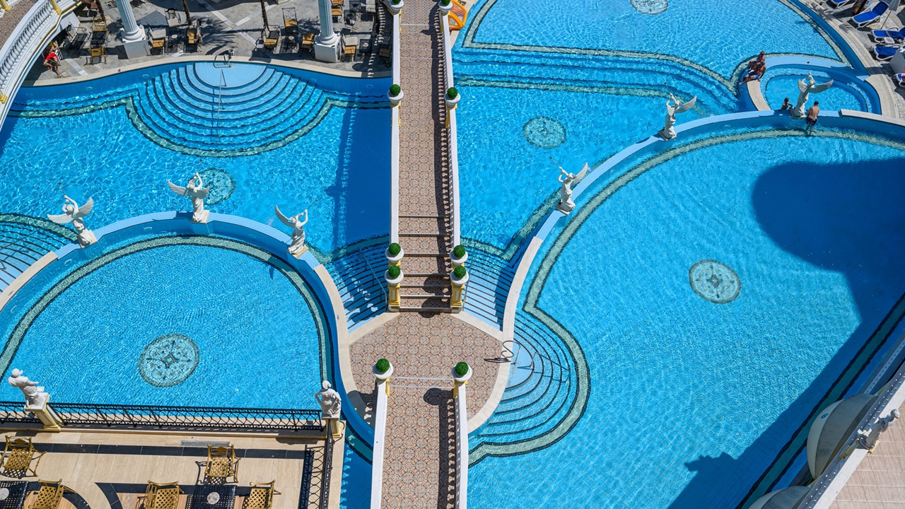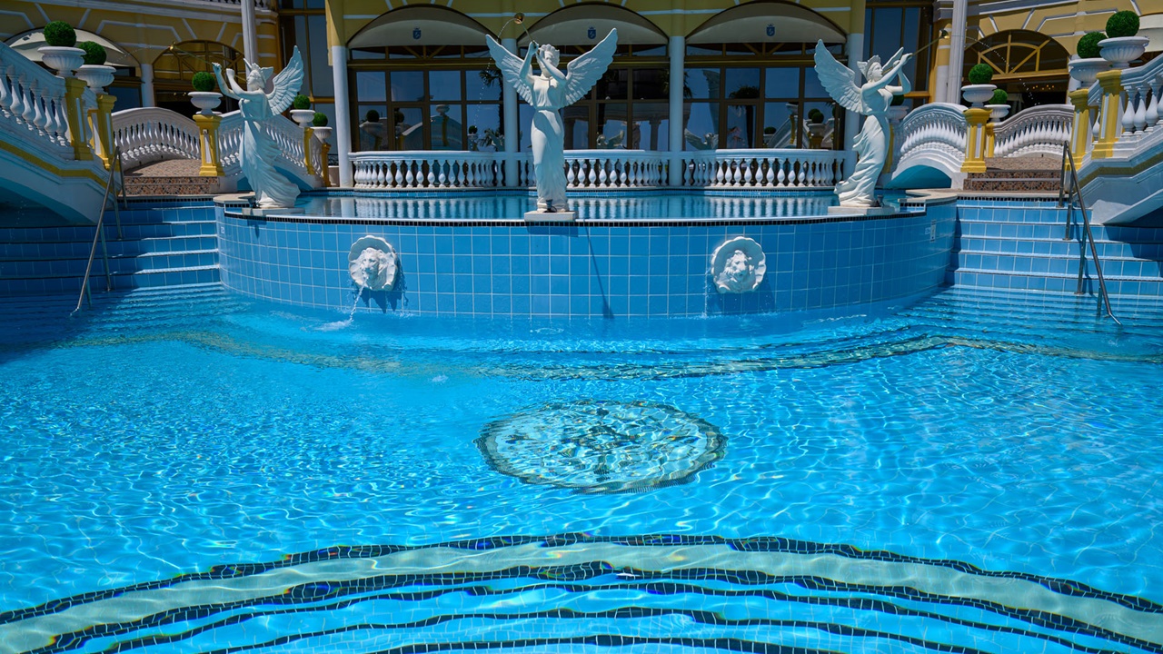 Външните басейни на Империал Палас Хотел 4*, Слънчев бряг са притегателна точка за гости от всички възрасти. Заобиколени от екстравагантна смесица от палми, великолепна зеленина и величествени мраморни статуи, те предлагат вълшебни моменти на празничност, удоволствие и наслада. Пищните подредби включват 400 шезлонга и 200 чадъра (безплатни за нашите гости), както и отделена ВИП зона за тези, които обичат уединението. Романтични мостчета свързват басейните с основната сграда на хотела, като по този начин осигуряват по-бърз достъп до удобството на нашите стаи и студиа. С дълбочина до 1,5 м., три от басейните са чудесен избор за индивидуални плувни занимания, качествен отдих, предизвикателни активности и весели игри. Детският басейн е прекрасно място за веселие и пръскане с вода под лятното слънце. Дълбочината му е между 0,2 и 0,5 м. и е отделен с метални прегради от основната дълбока част, предназначена за възрастни. Двата бара край басейните - Империал Пул Бар и Сафари Лоби Бар - добавят настроение към мечтаната ваканция, като сервират освежаващи коктейли, вкусни закуски и леки ястия. За удобството и сигурността на гостите между 08:00 и 17:00 ч. се грижи опитен спасител.