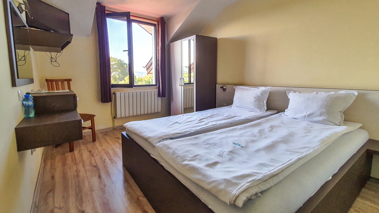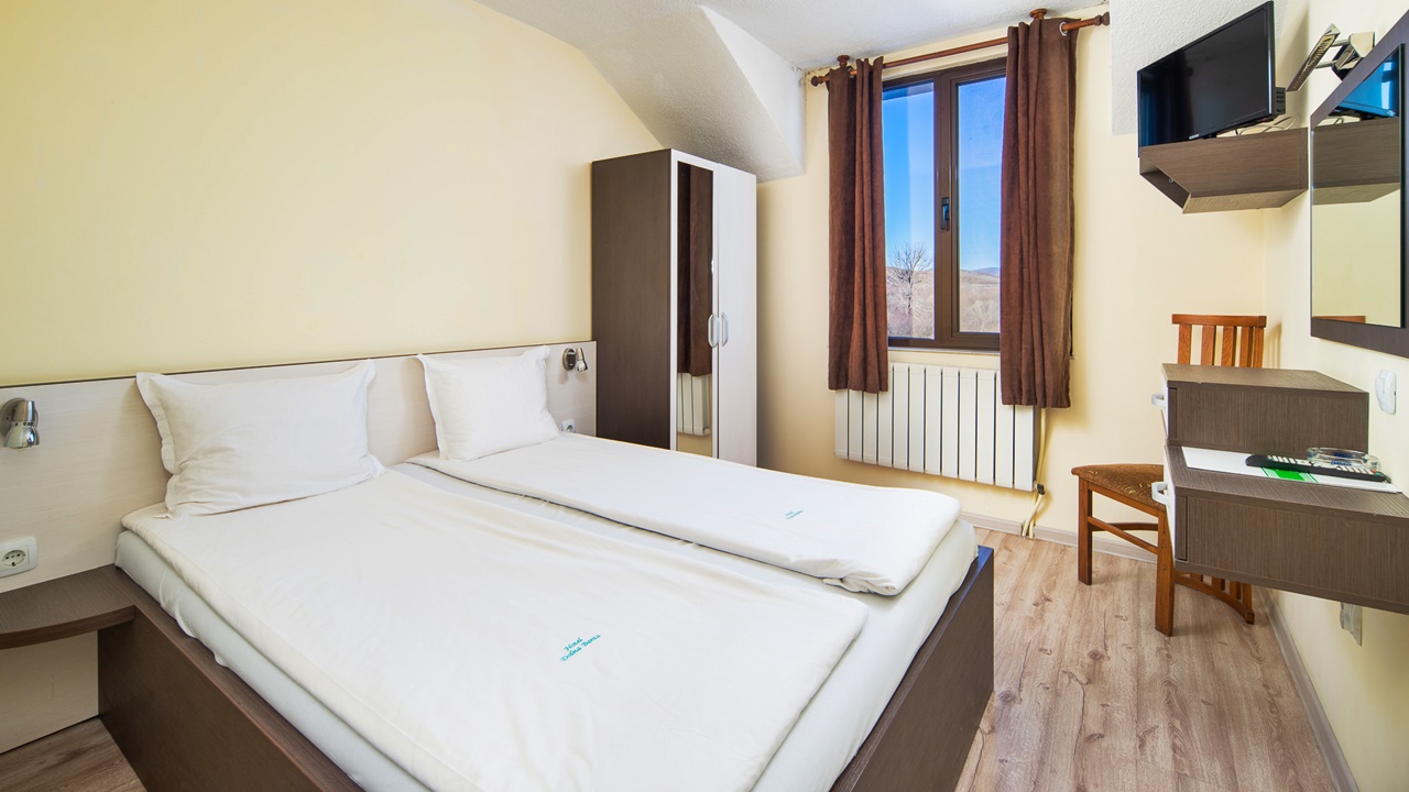 - икономична двойна стая - Икономичните стаи са около 12 кв. м. и разполагат с цяла спалня, телевизор с кабелна телевизия, безжичен интернет и самостоятелна баня с душ, нямат балкони