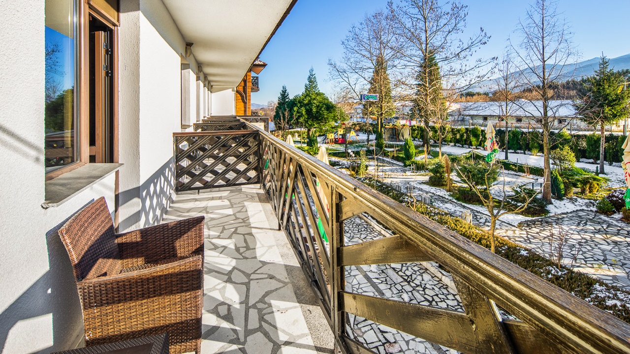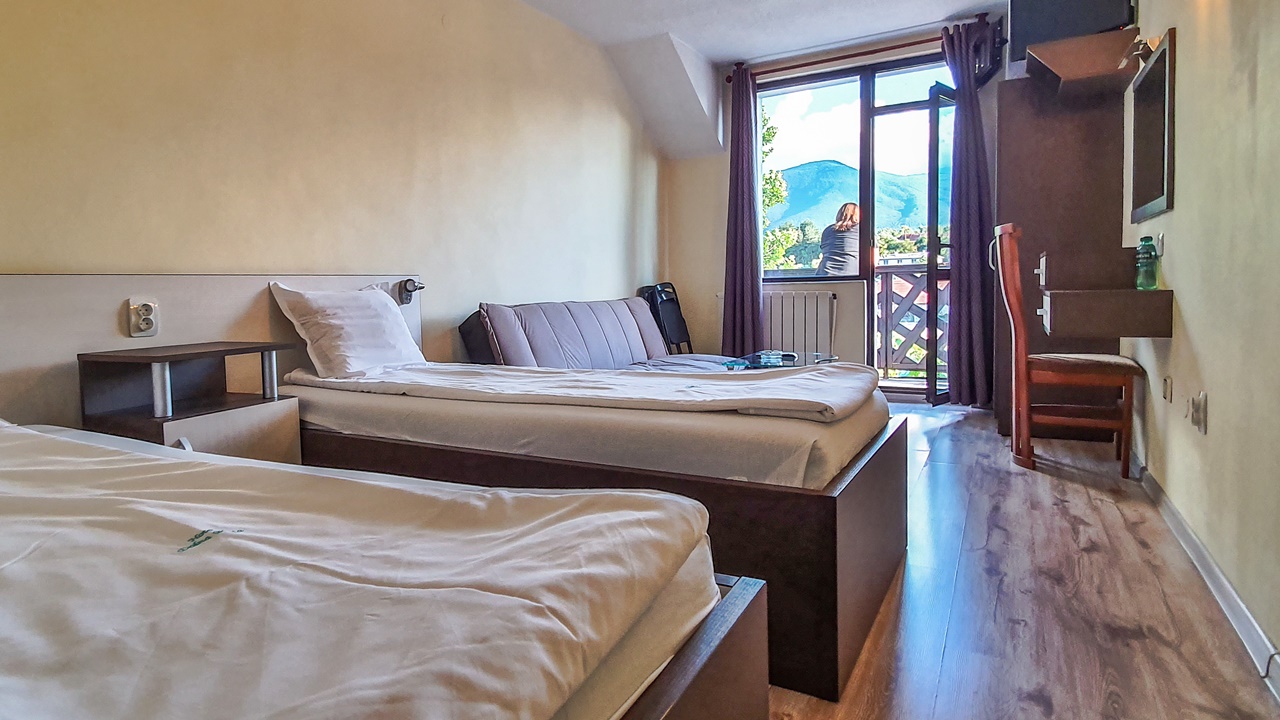 - двойна стая с балкон - Двойните стаи с балкон са около 14 кв.м. и разполагат с две единични легла, разтегателен диван, телевизор с кабелна телевизия, безжичен интернет, самостоятелна баня с душ, балкон