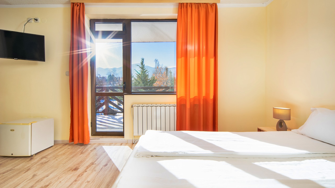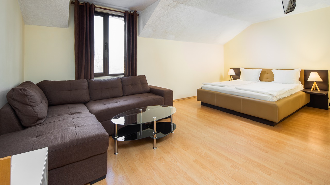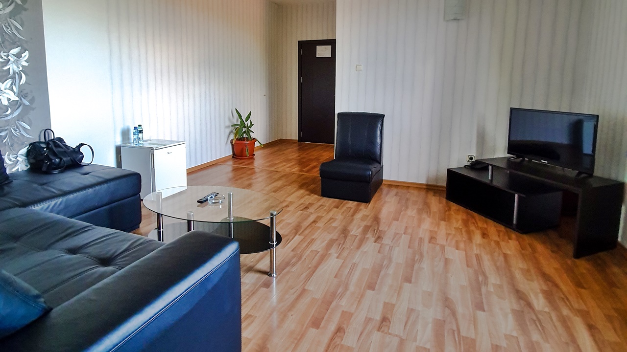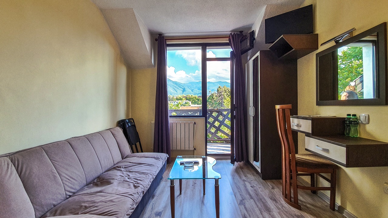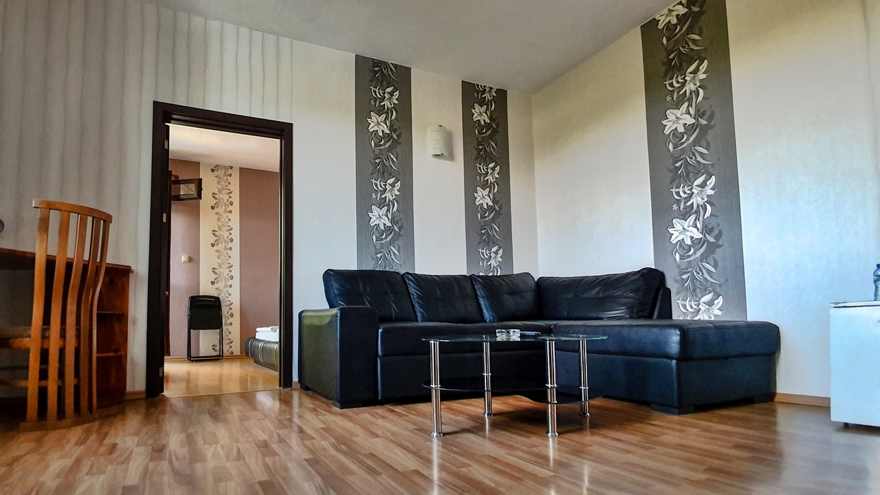 - апартамент с 1 спалня - едноспалните апартаменти са площ около 40 кв.м. и разполагат с две помещения - една спалня и една всекидневна с разтегателен диван, малък хладилник, телевизор с кабелна телевизия, безжичен интернет, самостоятелна баня с хидромасажна вана, балкон