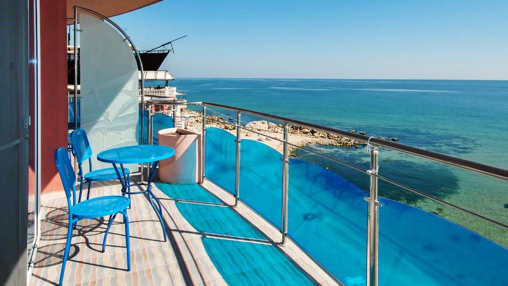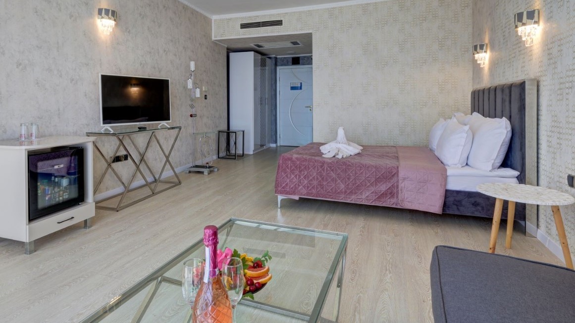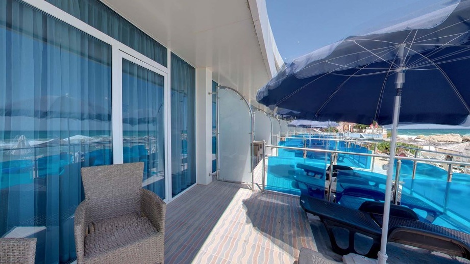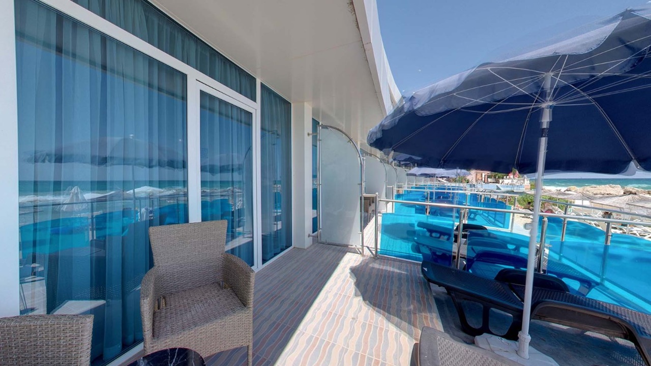- Двойните Делукс стаи са с площ 35 кв.м и 25 кв.м и са изцяло реновирани през 2023 г. Разполагат с прилежаща тераса, разположена на самия плаж. Стаите от този тип разполагат със стълба на терасата, която отвежда гостите директно на морето. На терасите ще откриете още индивидуален чадър и шезлонги за слънчеви бани. Стаите разполагат със спалня, масичка, разтегателен фотьойл, нощни шкафчета, 43" LCD телевизор с цифрова телевизия, баня с вана, душ и WС, стенен сешоар, кафемашина с капсула, минибар. Стаите са предназначени само за възрастни и са суперлуксозни.