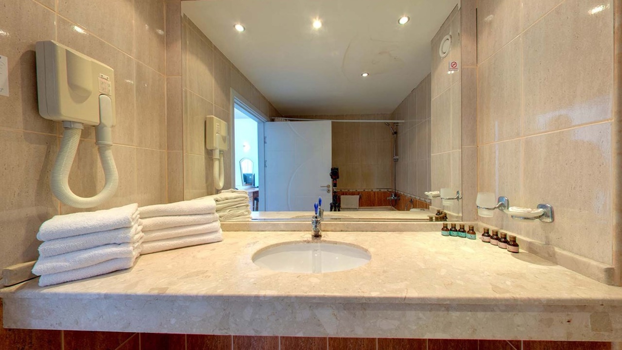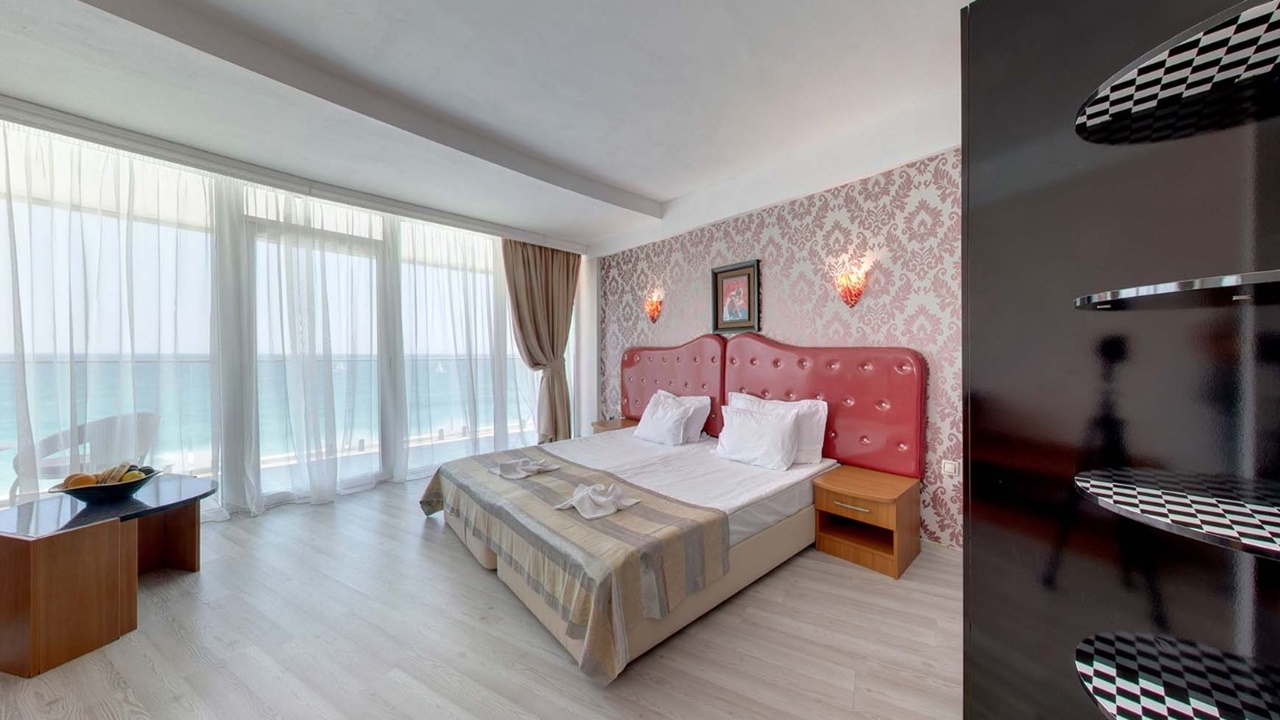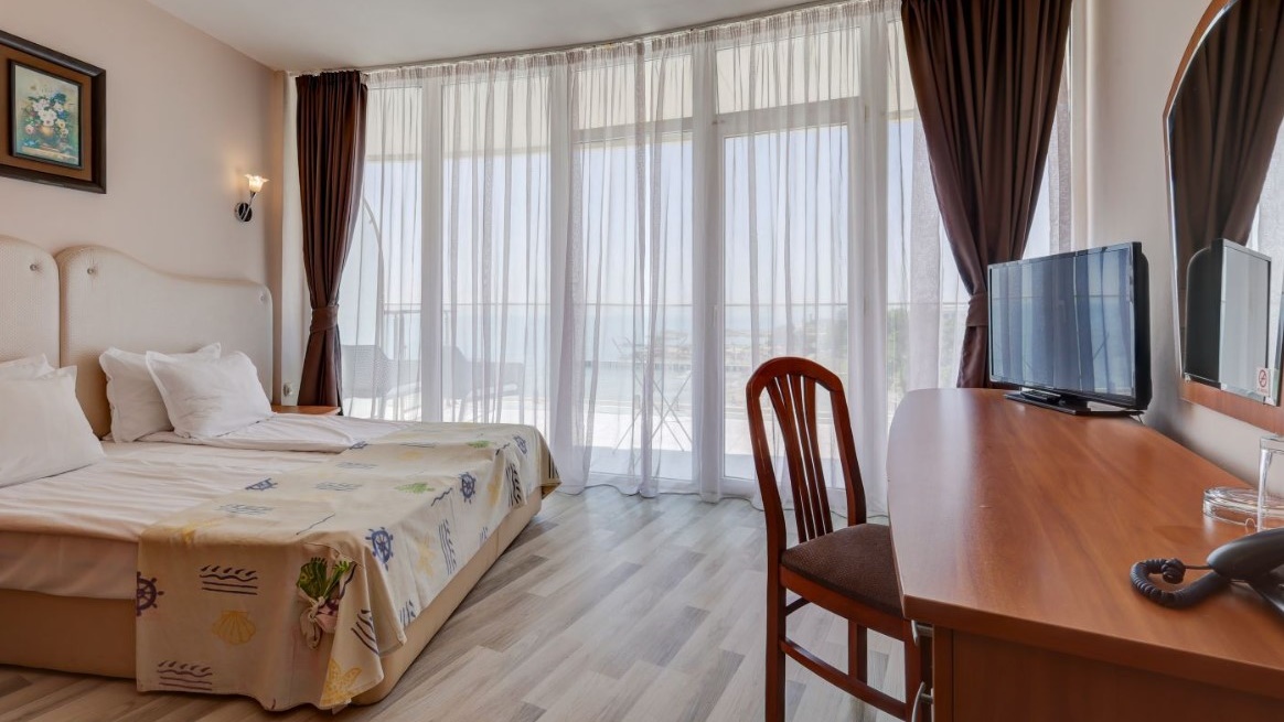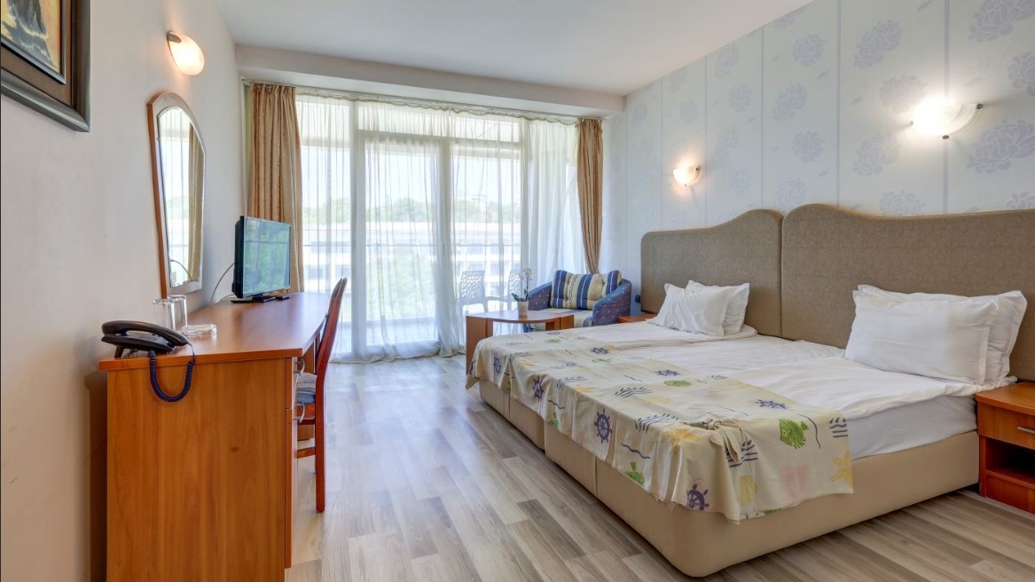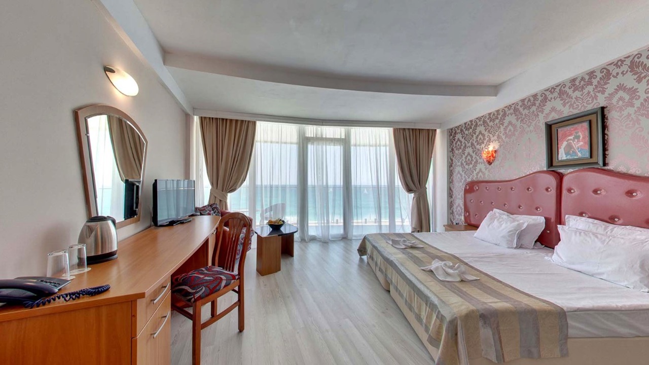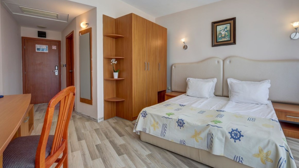 - Двойните стаи са средна площ 22-25 кв.м., две редовни легла/спалня, разтегателен фотьойл (разтегателен диван в някои двойни стаи море), гардероб, място за багаж, LCD телевизор, мини хладилник, сейф (сейф срещу допълнително заплащане), огледало, централна климатизация, телефон, баня с вана, сешоар, балкон с маса и столове, хотелска козметика, консумативи и хавлии за баня. В двойните стаи Море има разтегателно диванче