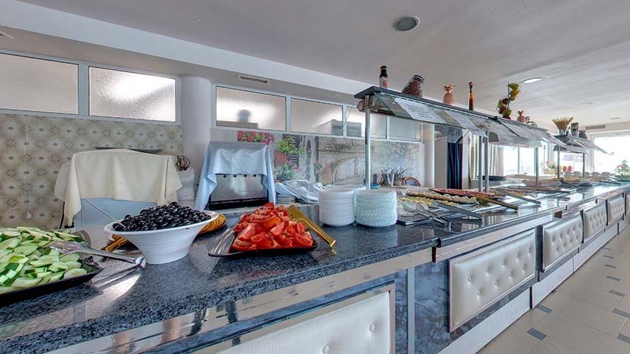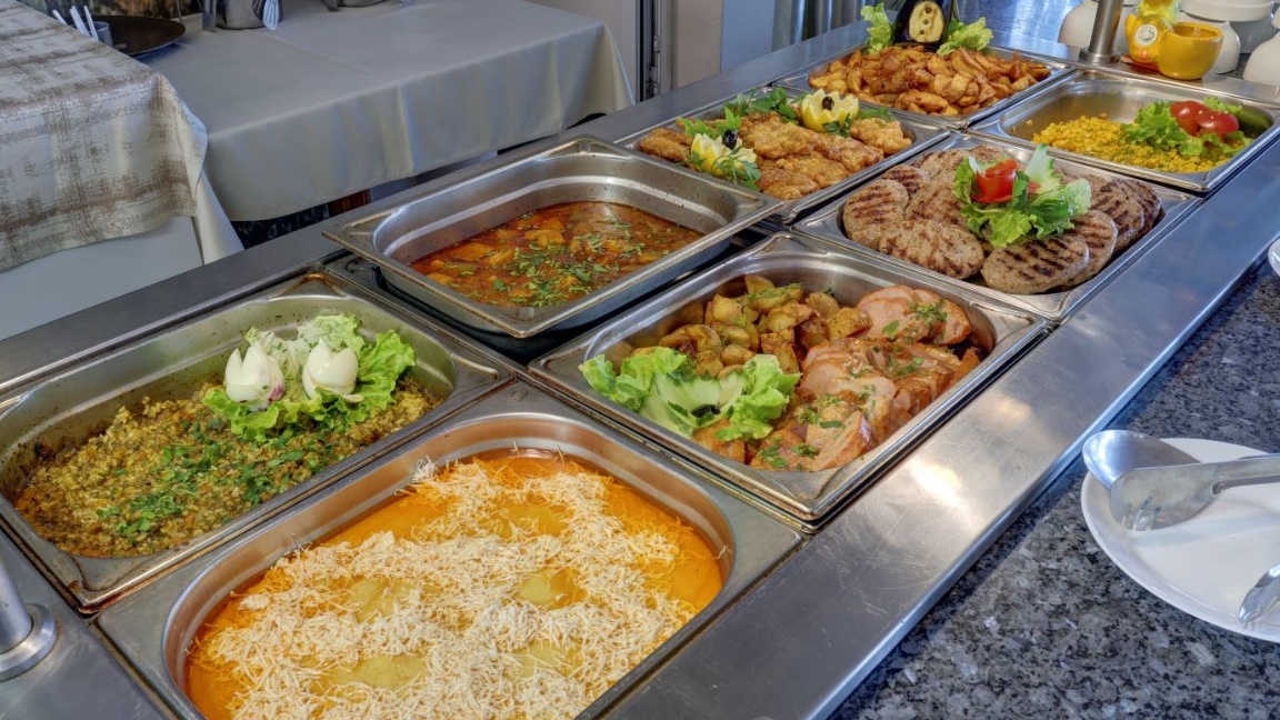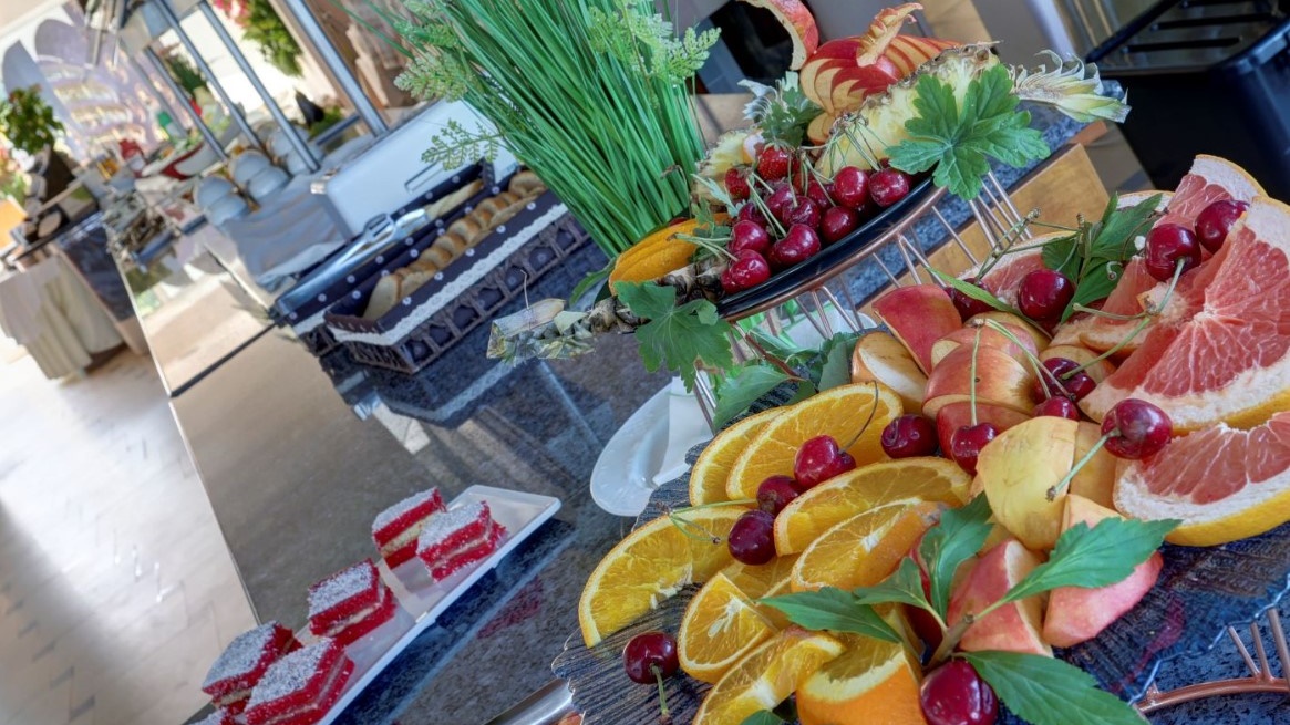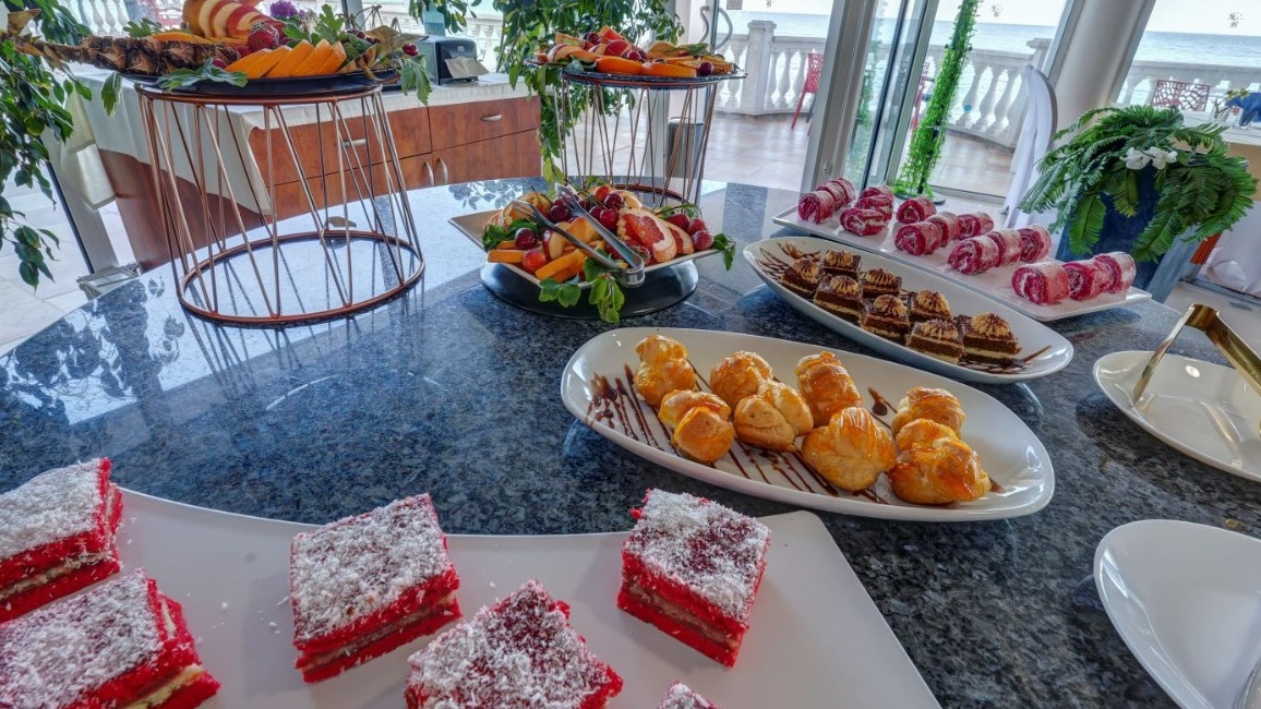 - Предлага за закуска богато разнообразие от колбаси, сирена, яйца, баница, печива, кроасани, зърнени закуски, макарони, сезонни плодове и зеленчуци и др. Напитки по време на закуската от 08:00 до 10:00 часа: Топли напитки от кафе-автомат - кафе инстантно, мляко с кафе, капучино, топъл шоколад, мляко, чай (билков, черен); Вода от диспенсър; Сокове от машина