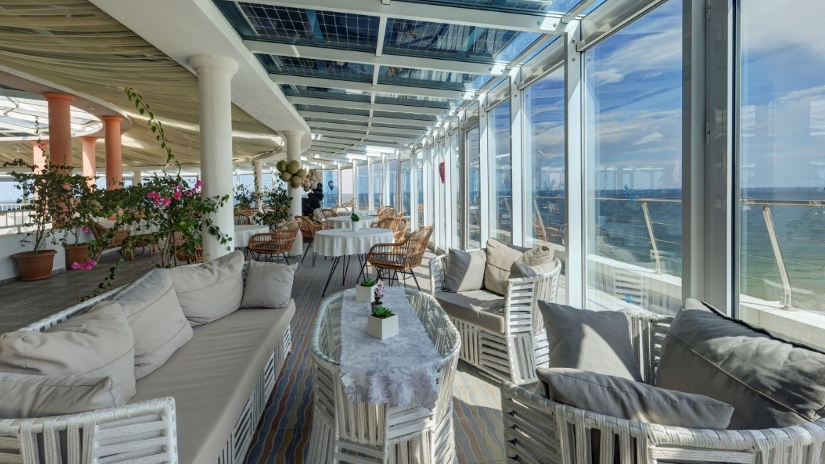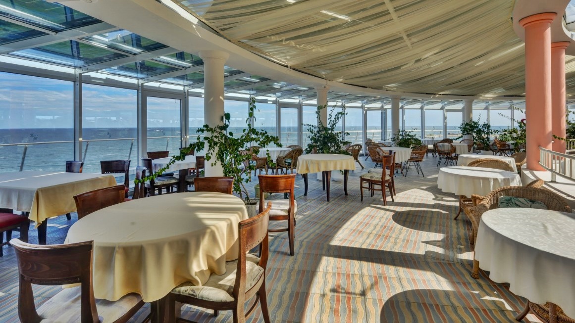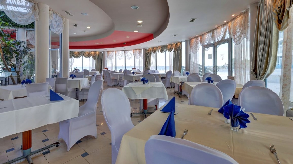 - Основен ресторант „Сириус“- общият капацитет на ресторанта е 200 места на закрито (на двете нива на ресторанта) и 200 места на 2-те тераси на самия бряг на морето. Едната голяма открита панорамна тераса със спираща дъха морски изглед към основния ресторант разполага със 140 места, а другата тераса с морска гледка към открития басейн разполага с 60 места