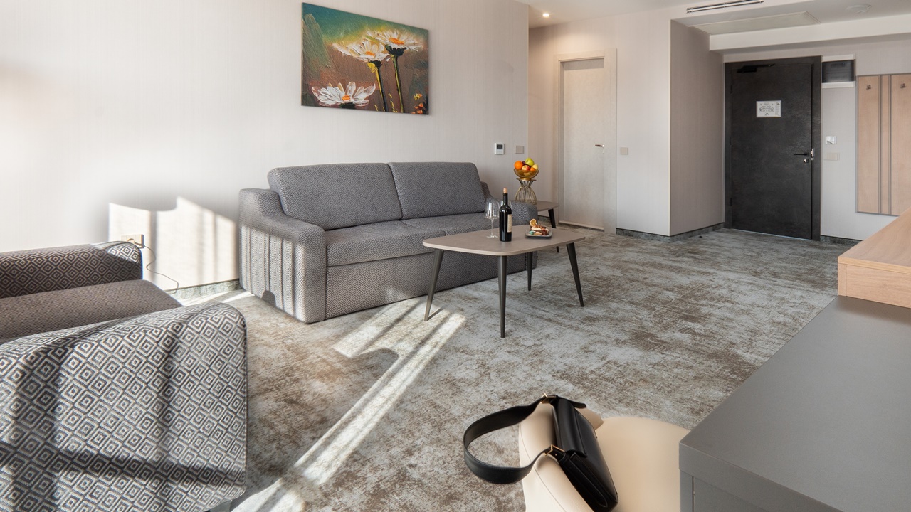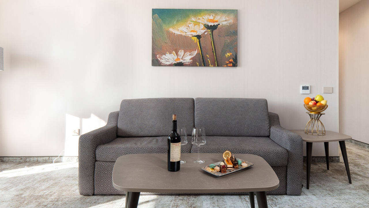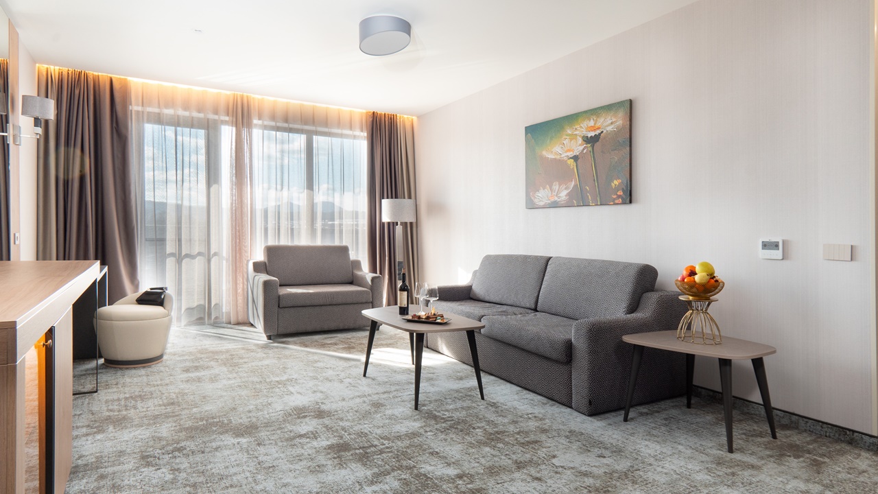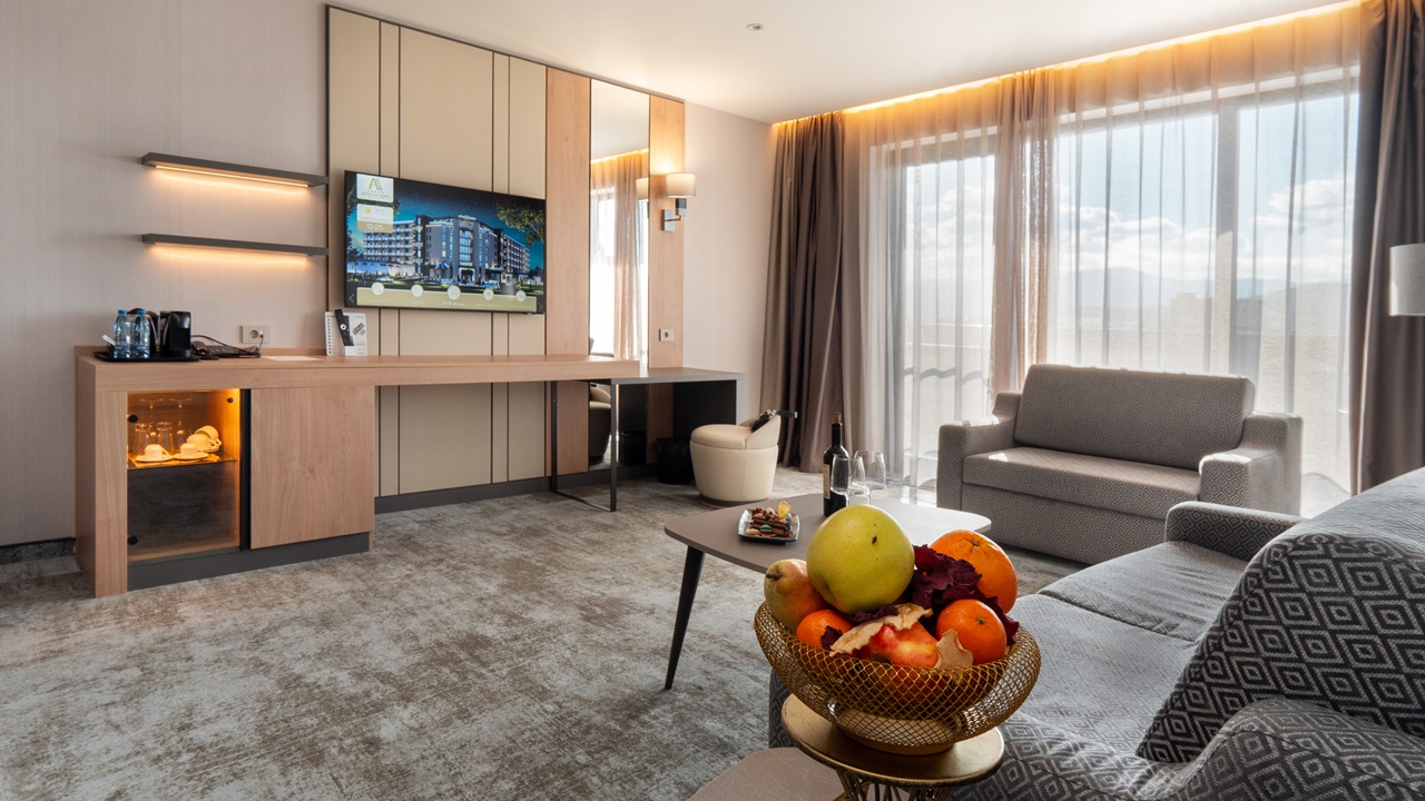 - апартамент с 1 спалня - Едноспалните апартаменти са с площ около 80 кв.м. и разполагат с две помещения - спалня и хол с разтегателен голям диван, 55'' LED телевизор, климатична система с индивидуално регулиране, кана за топла вода, сет за кафе и чай - комплимент, богато зареден минибар, безплатен сейф, тоалетни принадлежности, халат, чехли, сешоар и балкон