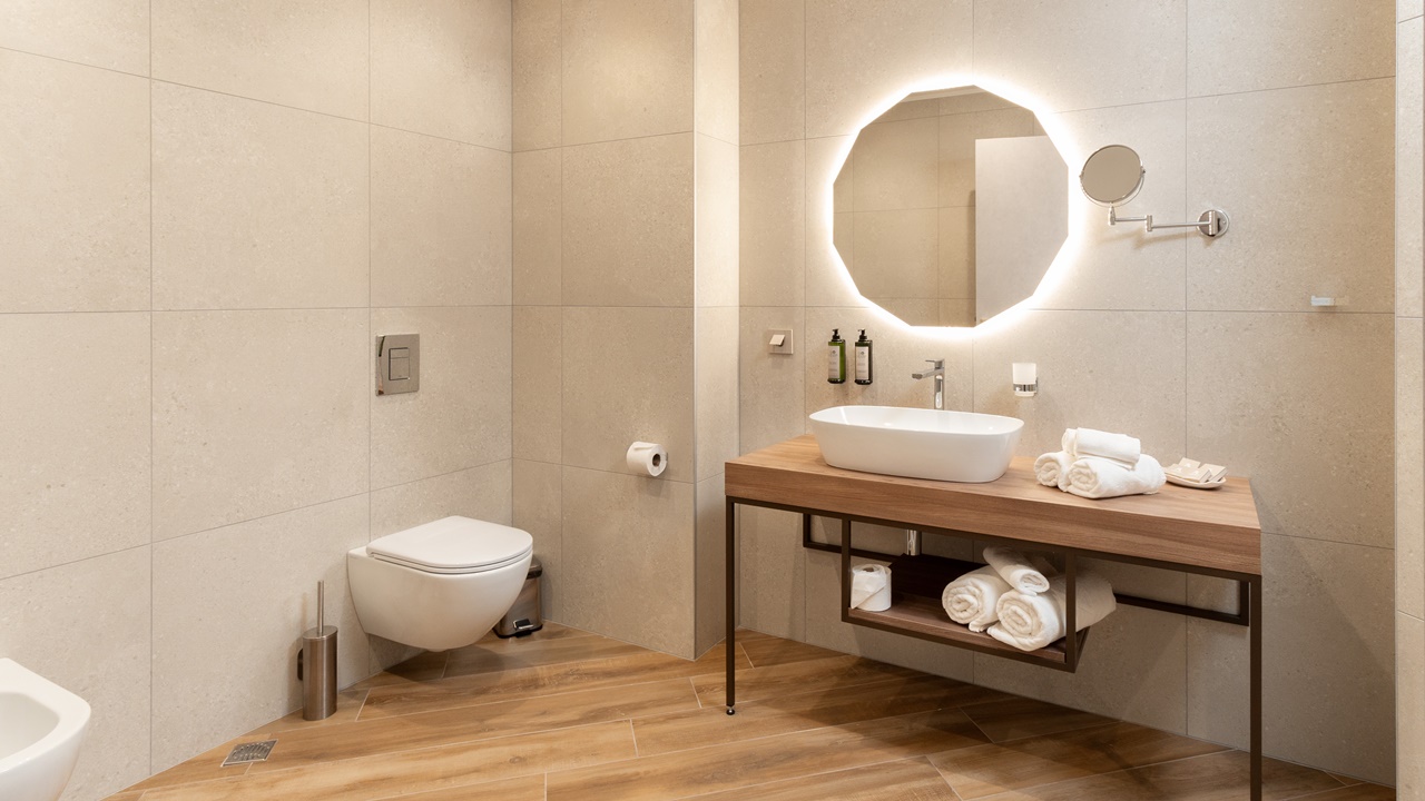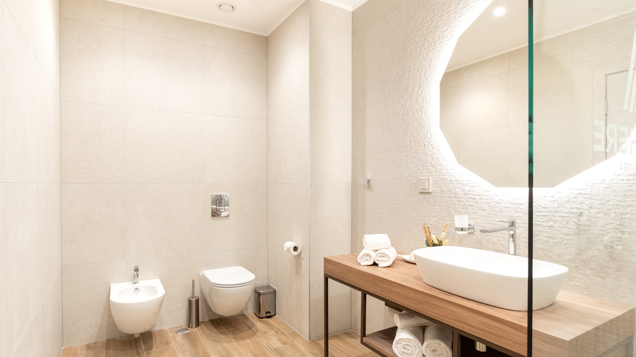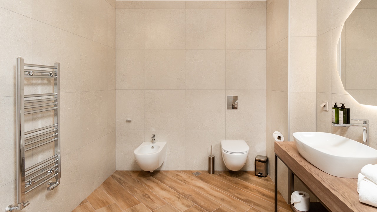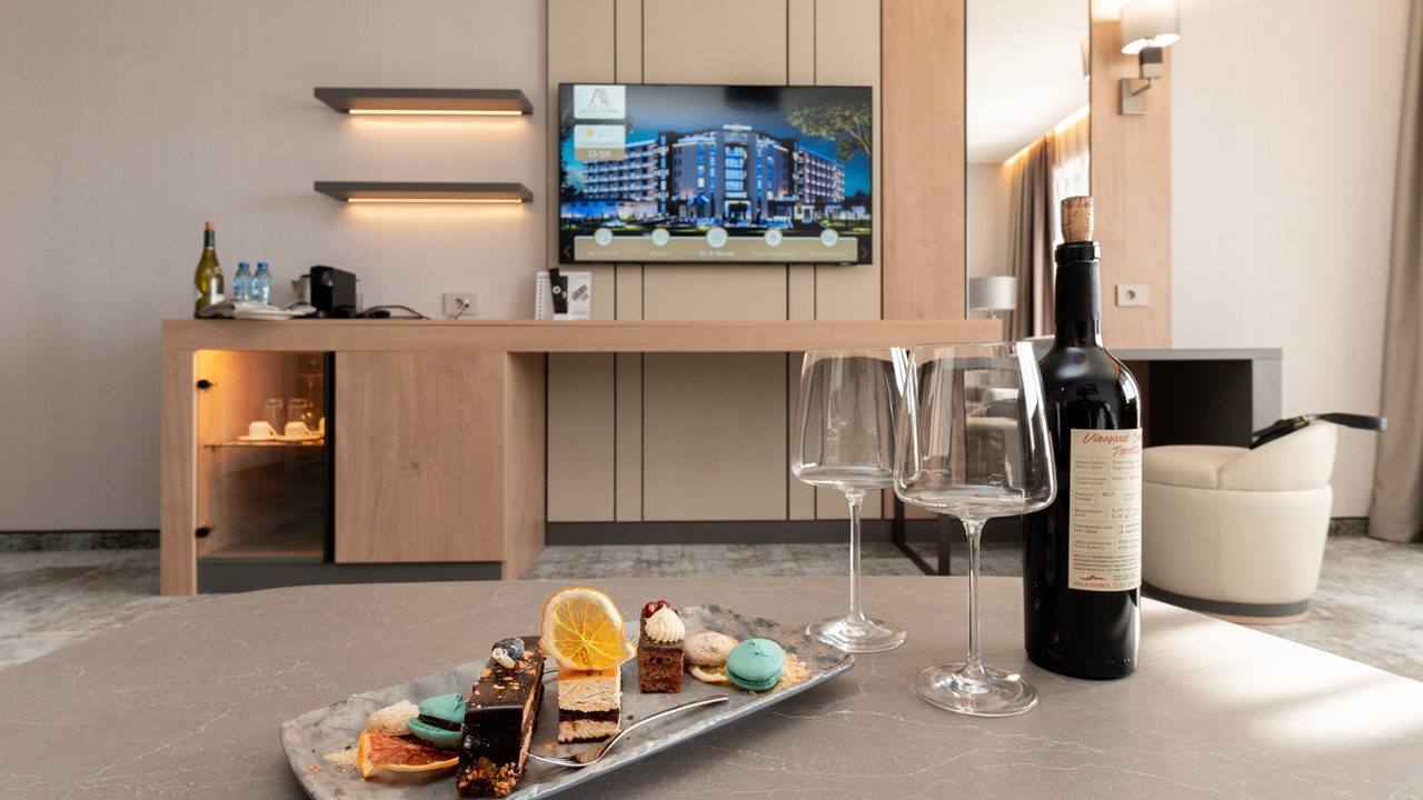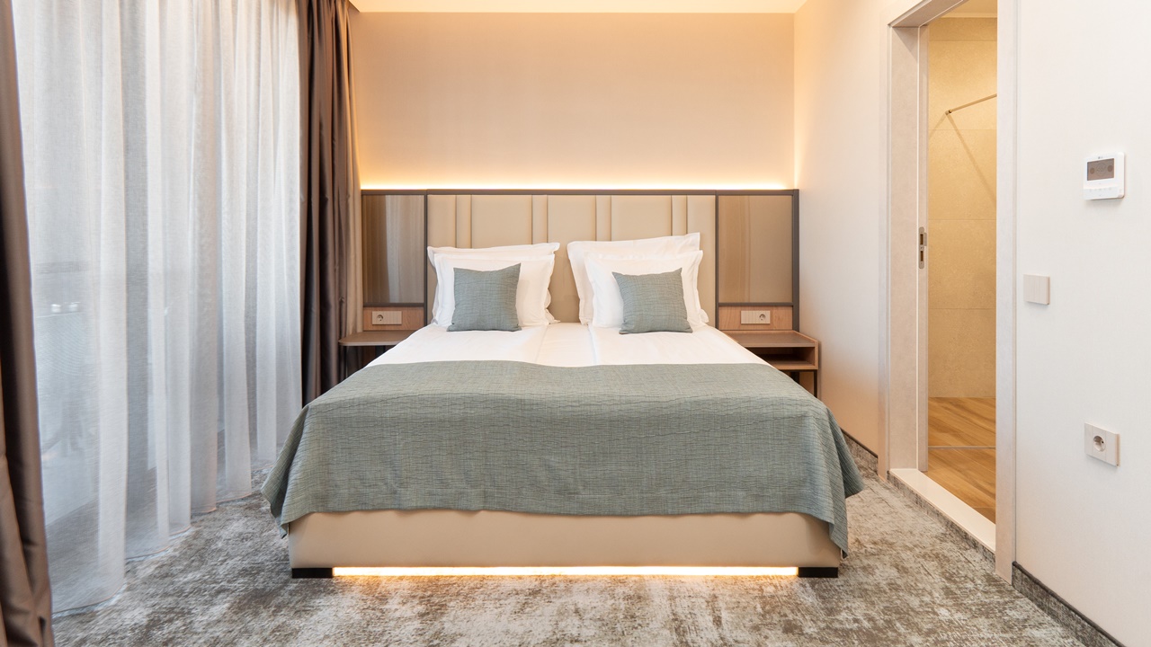 - апартамент с 1 спалня - Едноспалните апартаменти са с площ около 80 кв.м. и разполагат с две помещения - спалня и хол с разтегателен голям диван, 55'' LED телевизор, климатична система с индивидуално регулиране, кана за топла вода, сет за кафе и чай - комплимент, богато зареден минибар, безплатен сейф, тоалетни принадлежности, халат, чехли, сешоар и балкон