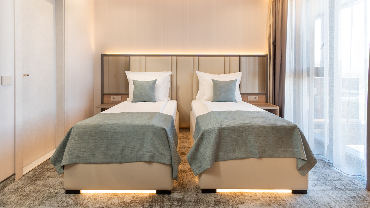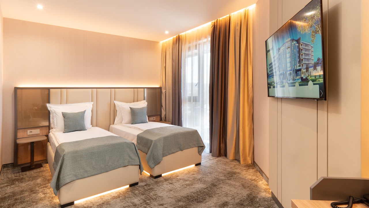 - двойна стая Стандарт без балкон - Стандартните стаи са с площ около 25 кв.м. и разполагат с две единични легла или спалня, 55'' LED телевизор, климатична система с индивидуално регулиране, кана за топла вода, сет за кафе и чай - комплимент, богато зареден минибар, безплатен сейф, тоалетни принадлежности, халат, чехли, сешоар, някои от стаите имат балкони