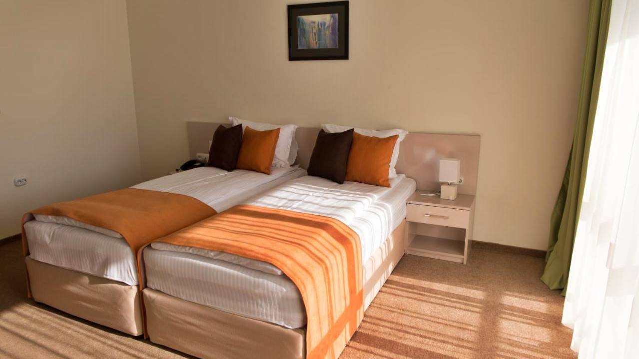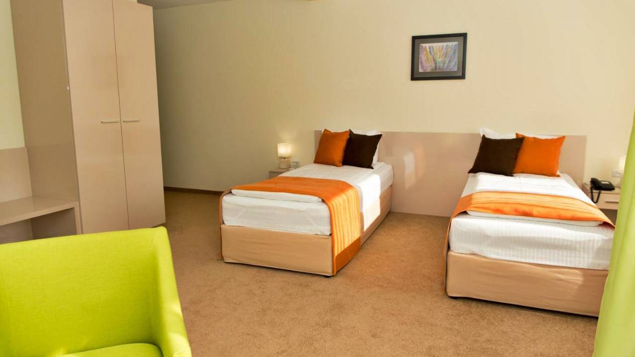 Гостите се настаняват в единични стаи с площ 16 кв.м. и двойни стаи с квадратура 37 кв.м. Всички помещения са оборудвани с телевизор, безжичен интернет, самостоятелна баня, шумоизолация, балкон и тоалетни принадлежности. Посетителите могат да се възползват и от отопляем вътрешен басейн с минерална вода, който работи целогодишно.