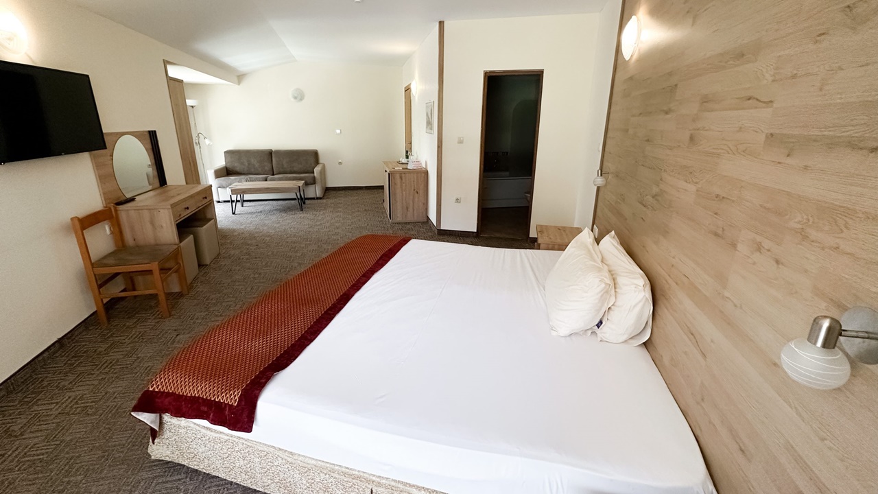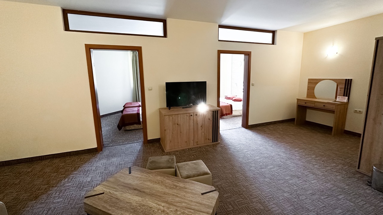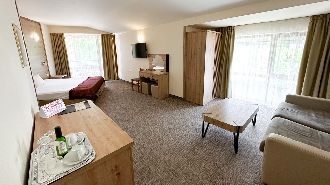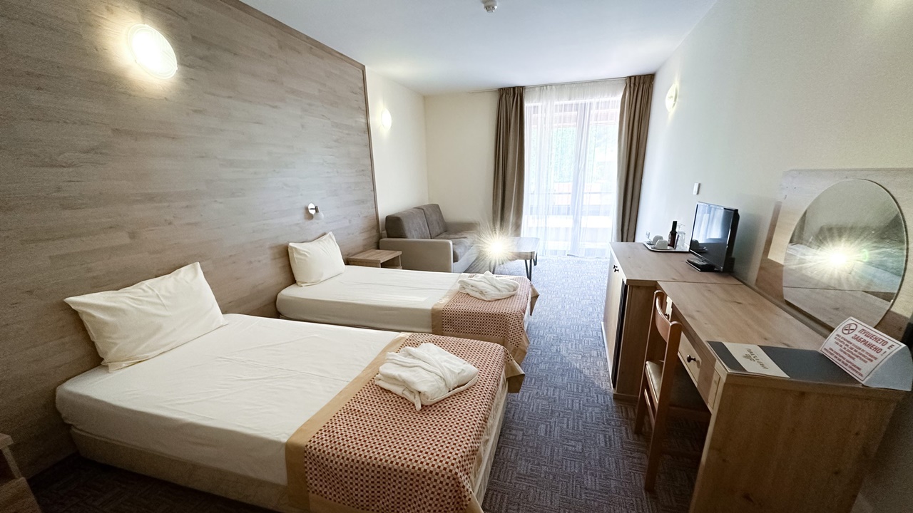 - фамилна стая с или без балкон - Фамилните стаи са със спални или 2 отделни легла и разтегателен диван. Повечето от стаите са с тераси, разполагат с маса и столове, бюро, телевизор с кабелна телевизия, телефон, електронни сейфове, санитарен възел: вана, душ, SOS система, сешоар, хотелска козметика, халати и хавлии. И не е нужно да търсите надалече минералната вода – тя тече от крана в банята.
