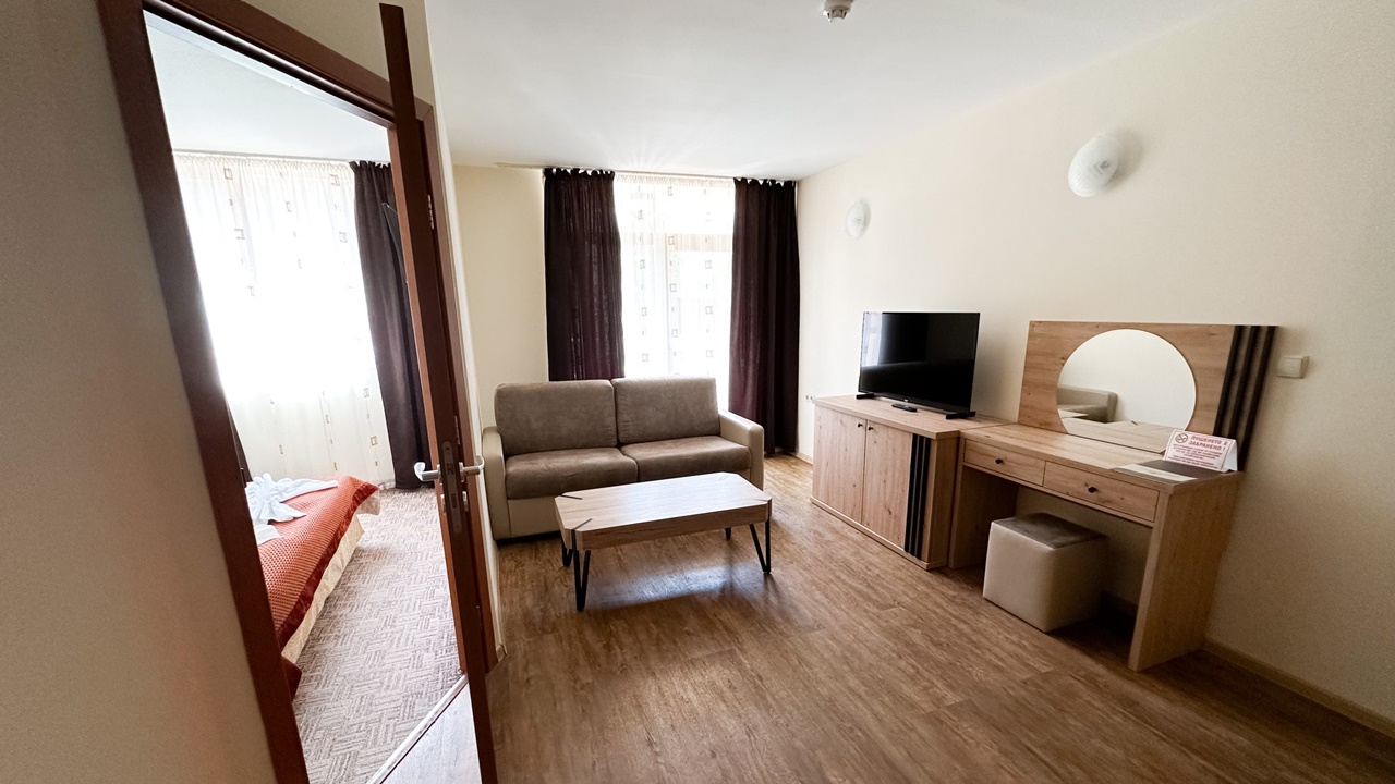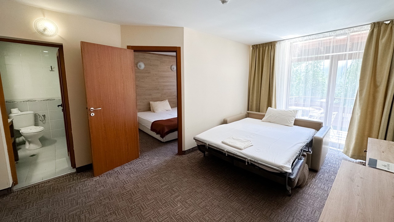- апартамент с 2 спални с балкон. Апартаментите с две спални се състоят от хол с разтегателен диван и две спални – стая със спалня и стая с две отделни легла. Разполагат с маса и столове, бюро, телевизор с кабелна телевизия, телефон, електронни сейфове, санитарен възел: вана, душ, SOS система, сешоар, хотелска козметика, халати и хавлии. И не е нужно да търсите надалече минералната вода – тя тече от крана в банята.