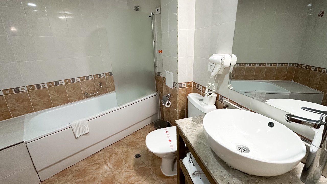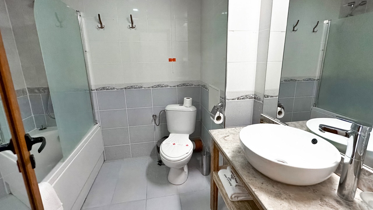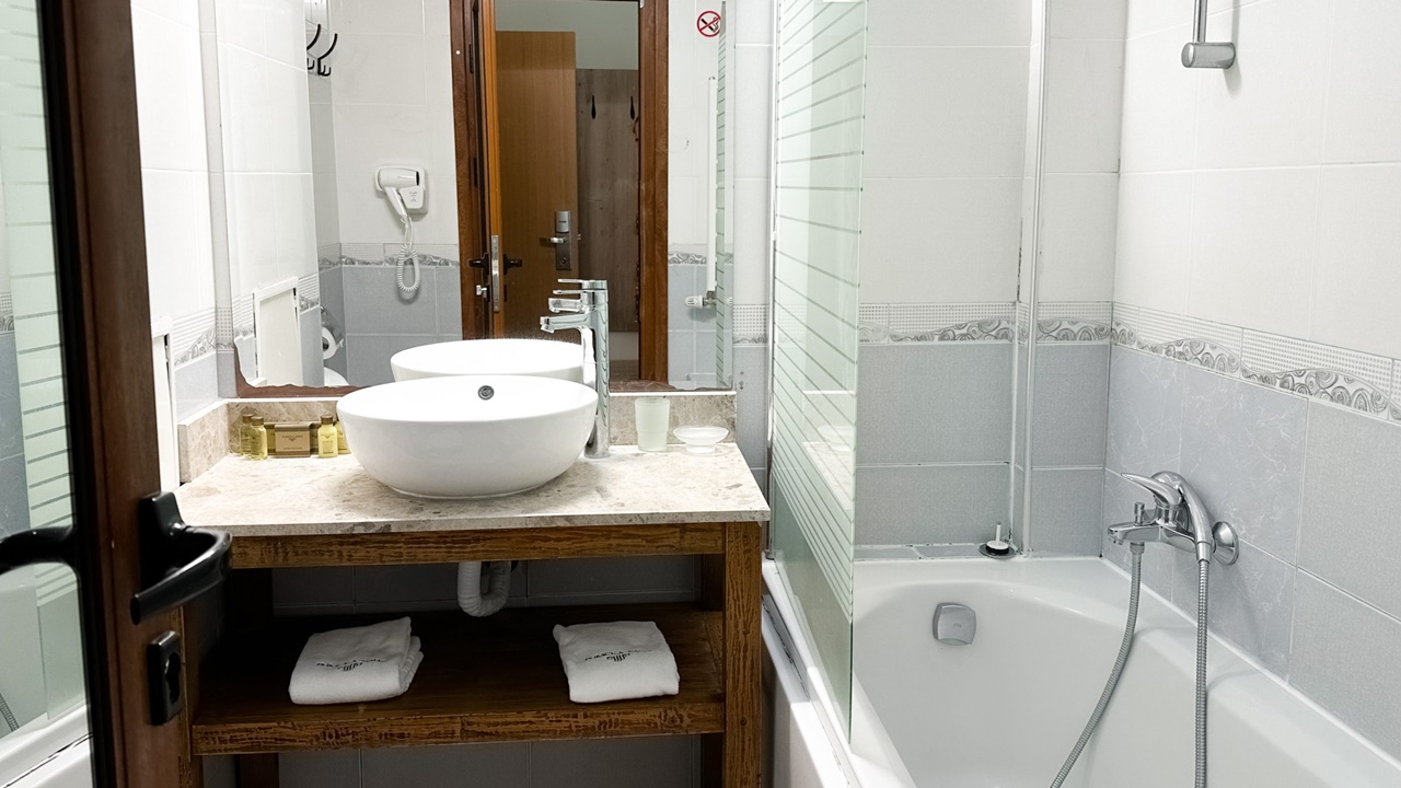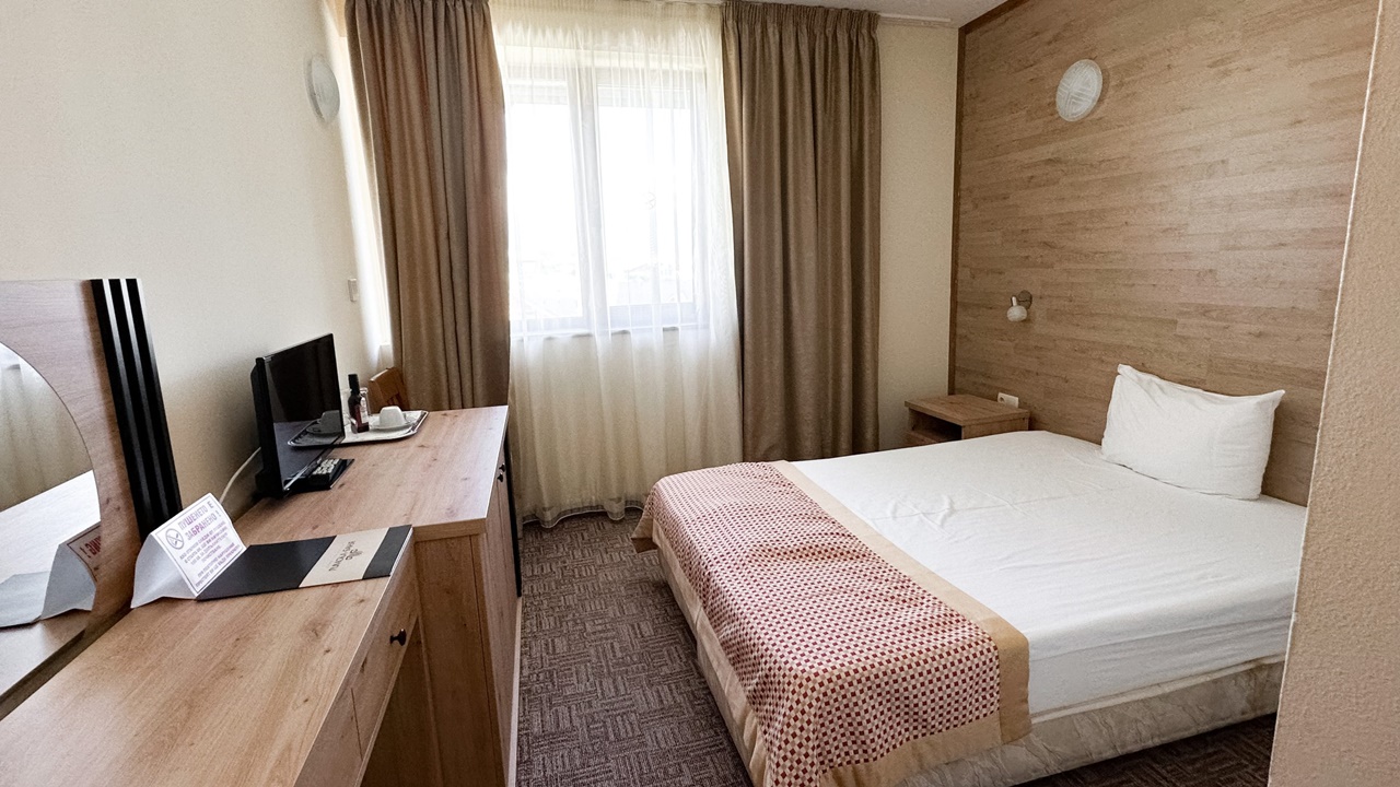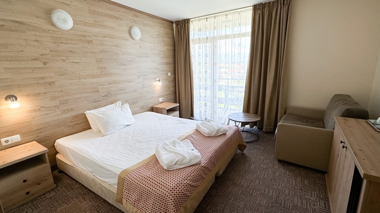 - двойна стая с или без балкон - Двойните стаи са със спалня или 2 отделни легла + опция за разтегателен фотьойл или кошара. Повечето от стаите са с тераси, разполагат с маса и столове, бюро, телевизор с кабелна телевизия, телефон, електронни сейфове, санитарен възел: вана, душ, SOS система, сешоар, хотелска козметика, халати и хавлии. И не е нужно да търсите надалече минералната вода – тя тече от крана в банята.