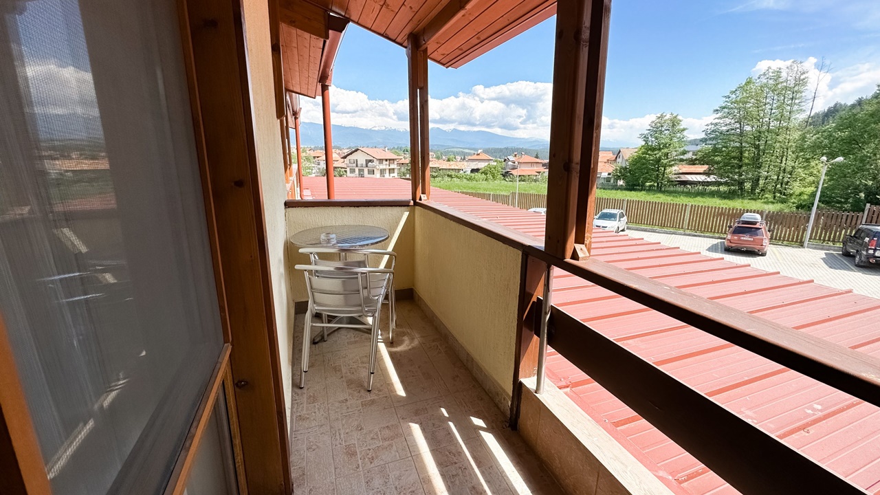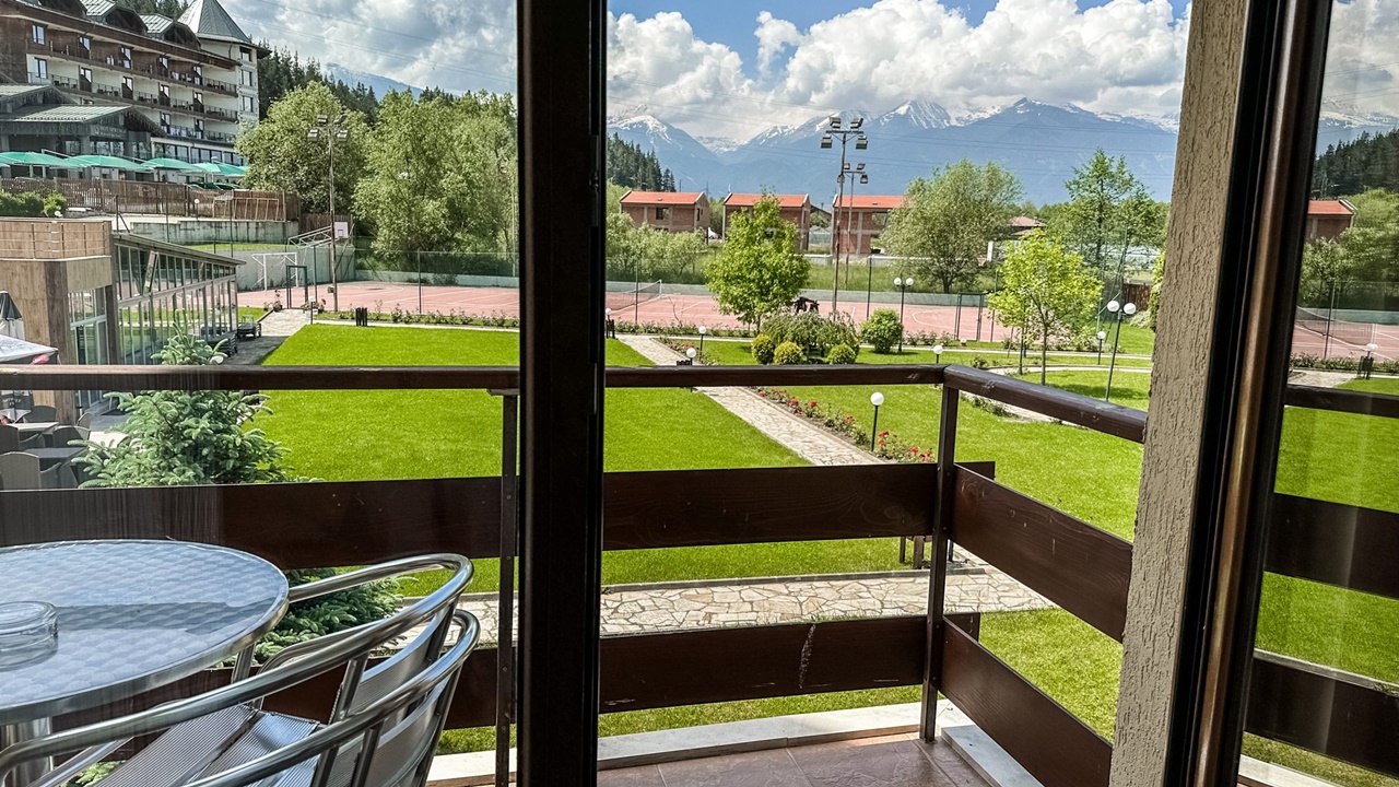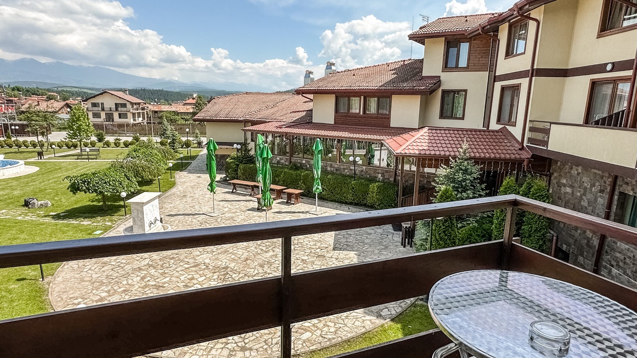 - апартамент с 1 спалня с балкон - Просторен двустаен апартамент с изглед към Пирин и Рила, гората или село Баня. Апартаментите разполагат със спалня и хол и неголяма тераса с маса и столове. Във всеки апартамент има маса и столове, бюро, телевизор с кабелна телевизия, телефон, електронни сейфове, санитарен възел: вана, душ, SOS система, сешоар, хотелска козметика, халати и хавлии. И не е нужно да търсите надалече минералната вода – тя тече от крана в банята.