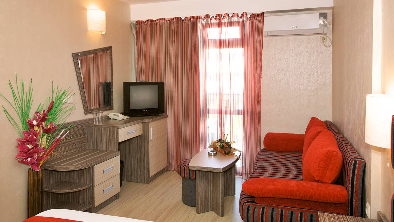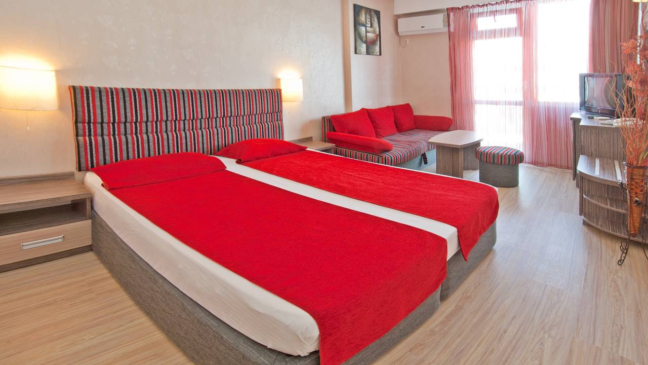 - двойна стая - Двойните стаи са оборудвани с балкон, индивидуална климатизация , сателитна телевизия, хладилник /тип минибар/, термокана, директен телефон, безжичен интернет, баня с душ кабина, сешоар. Стаите са обзаведени с допълнително легло/диванче