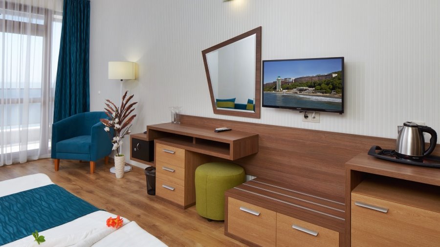 - всички помещения разполагат с допълнително легло - диван (190/82 см), телевизор, климатик, малък хладилник, тип мини бар (празен), сейф, кана за топла вода, чаши, тоалетни принадлежности (сапун, шампоан, душ гел, шапка за баня), хавлии. Хавлии за плажа и басейна се получават на определени места.