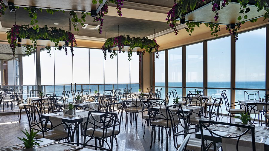 Разполага с основен панорамен ресторант с тераси над плажа, панорамен лоби бар с невероятна гледка към морето, бар до басейна, снек бар, бар Боулинг.