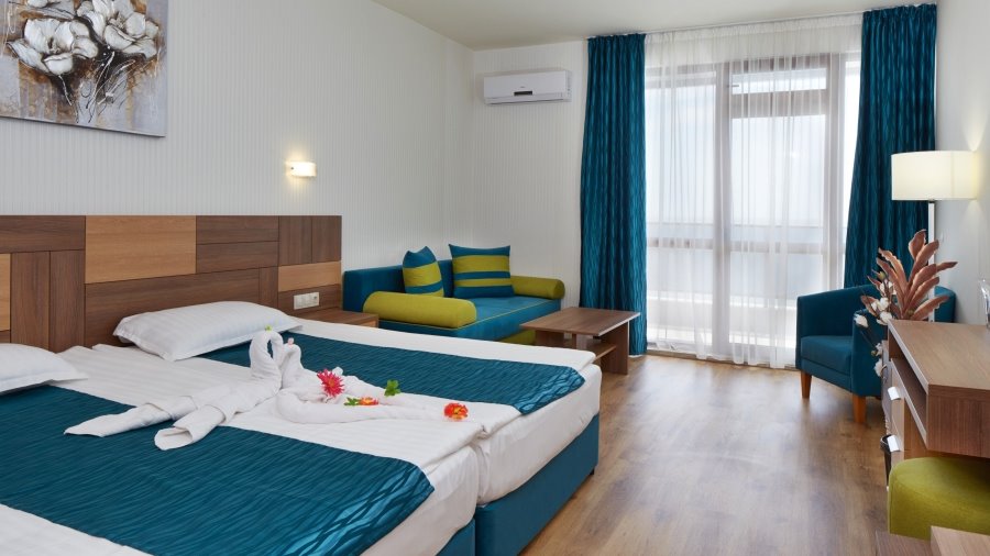 - двойна стая парк / двойна стая море/ 2 възрастни + дете до 11.99 год. и бебе или 3 възрастни.