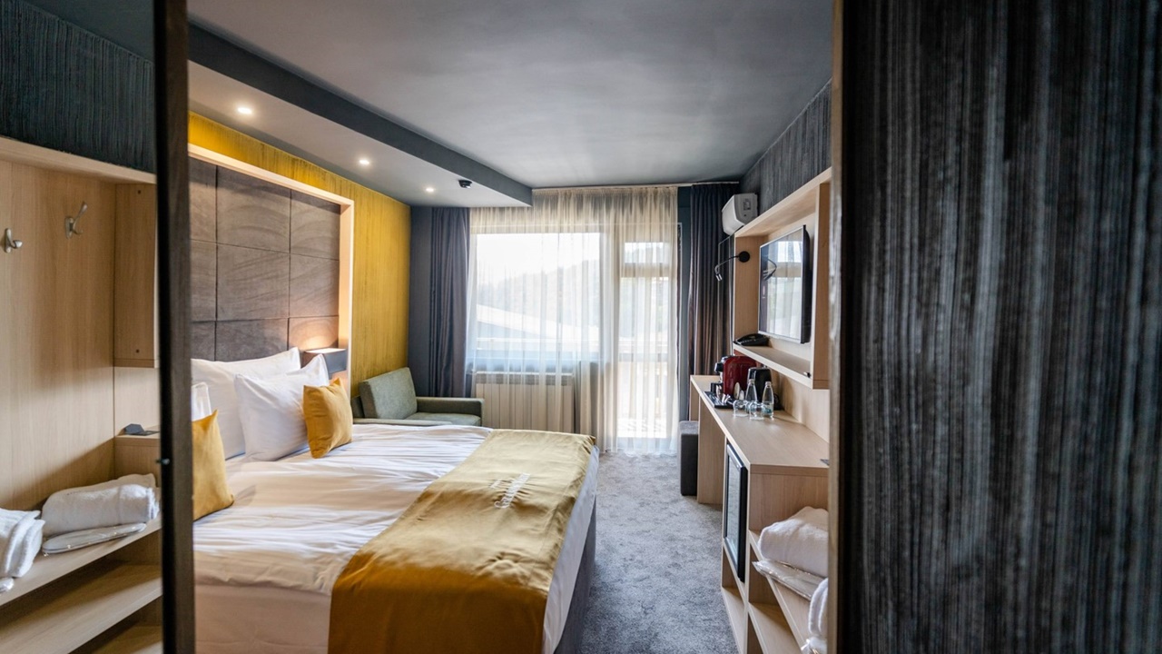 - двойна стая делукс - помещението разполага със спалня и разтегателен фотьойл и балкон, 28 кв.м.