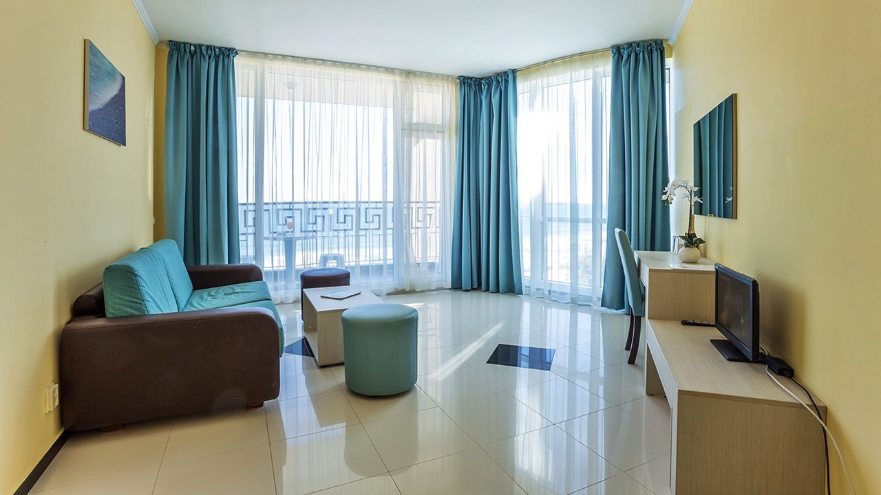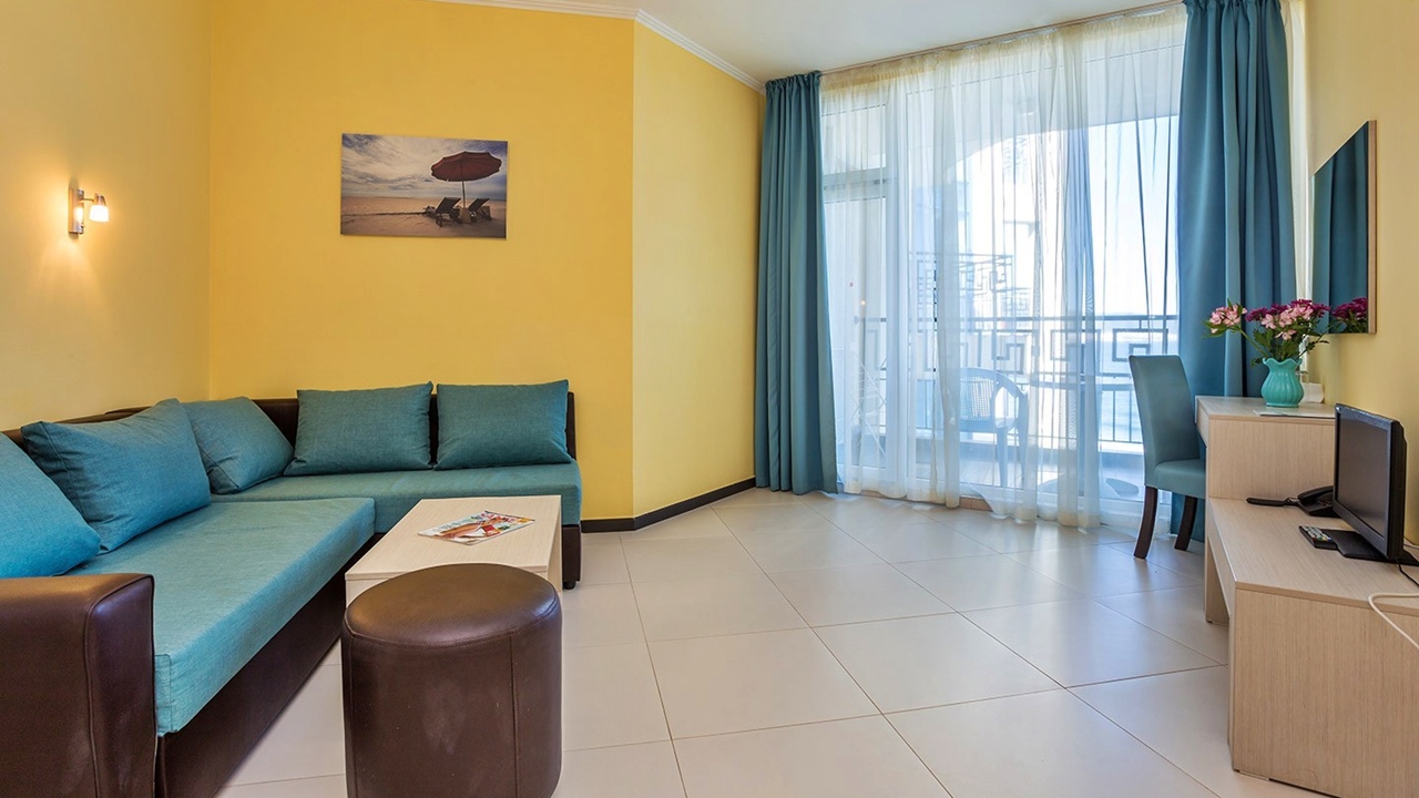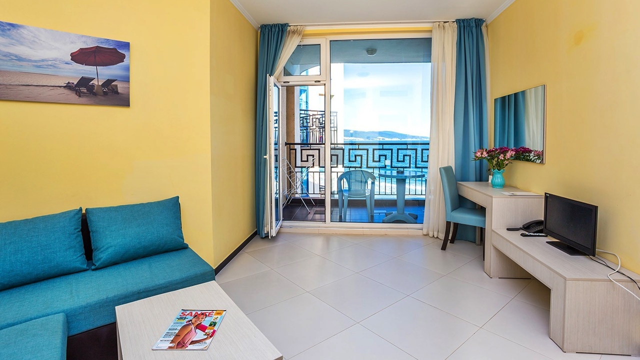 - апартамент с 1 спалня - разполагат със спалня или две единични легла, разтегателен диван, индивидуално контролиран климатик, хладилник, интернет и кът за сядане с телевизор допълват условията за приятна почивка. Банята разполага с душ, сешоар, кърпи и луксозни тоалетни принадлежности. Апартаментите разполагат с балкони с частичен или фронтален изглед море.