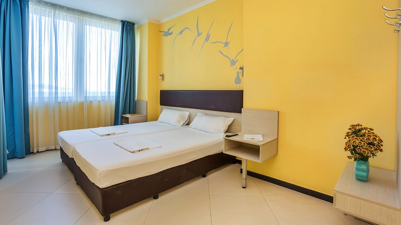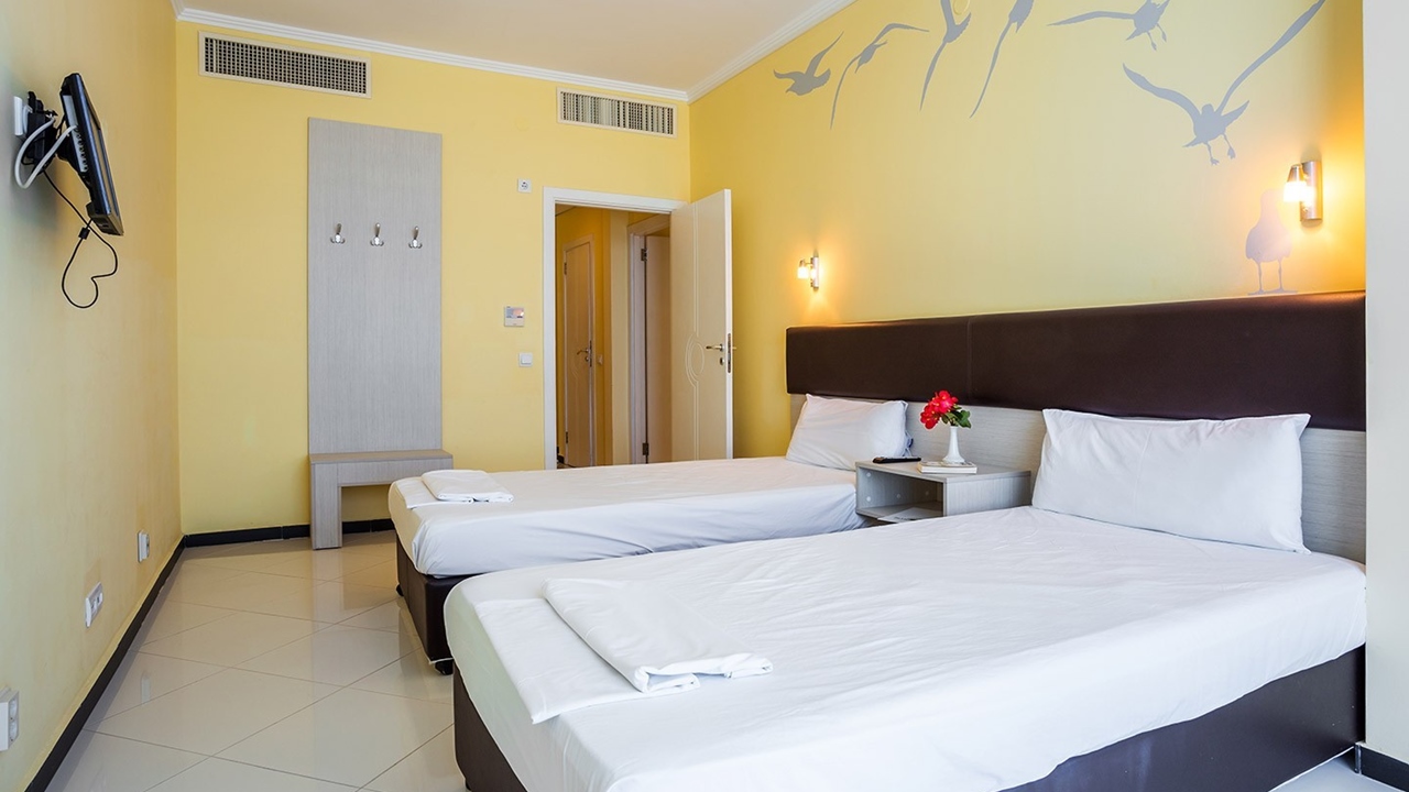 - апартамент с 2 спални - разполагат с две отделни спални всяка от които снабдена със собствена баня с вана и душ и сешоар. Апартаментите са оборудвани с мини хладилник, телевизор с плосък екран, телефон и климатик, а хола с разтегателен диван. Апартаментите разполагат с балкони и фронтален изглед море.
