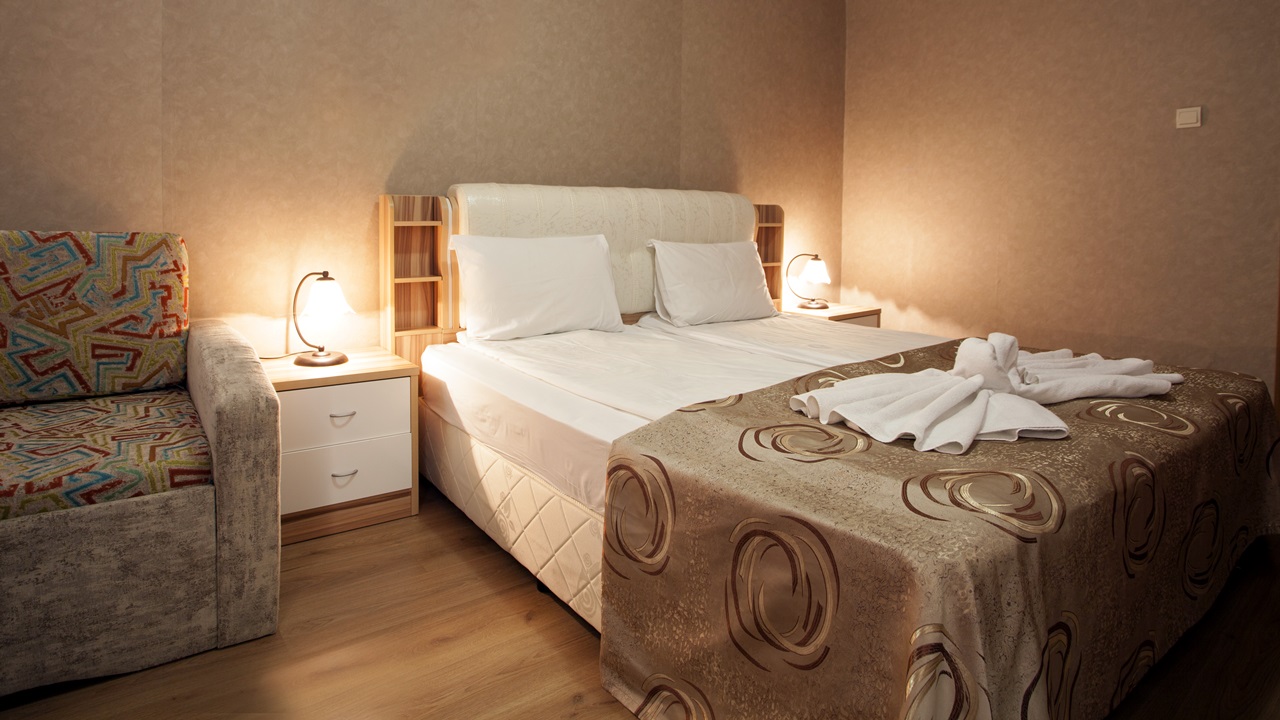- двойната стая - 3 възрастни или 2 възрастни и 2 деца (едното спи между родителите, тъй като има само едно допълнително легло - разтегателен фотьойл с размери 180 х 75 см.)