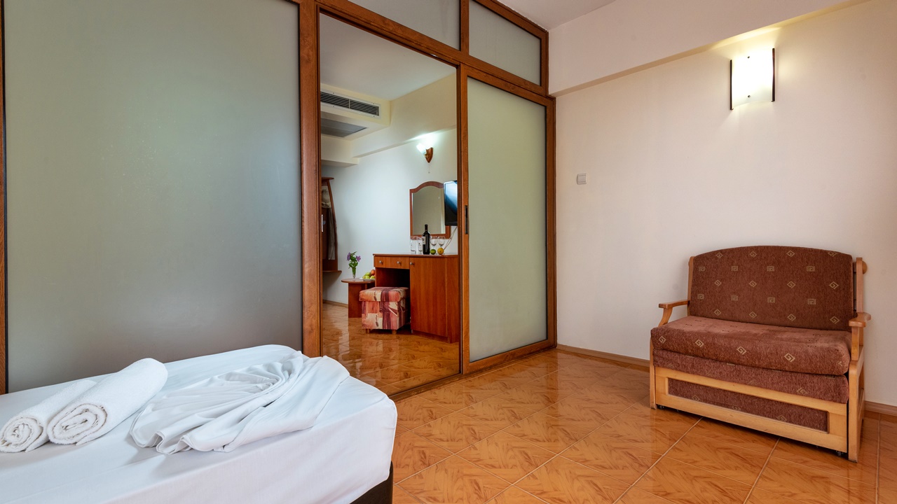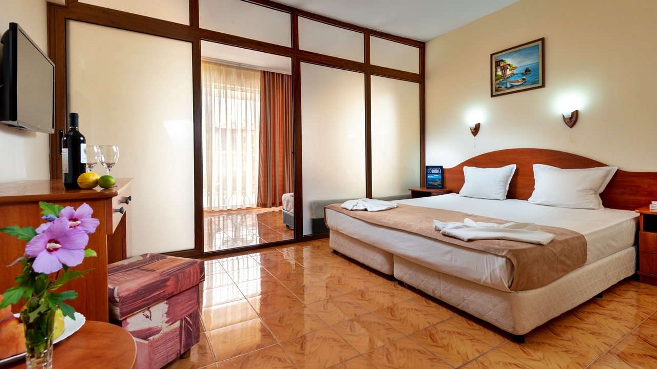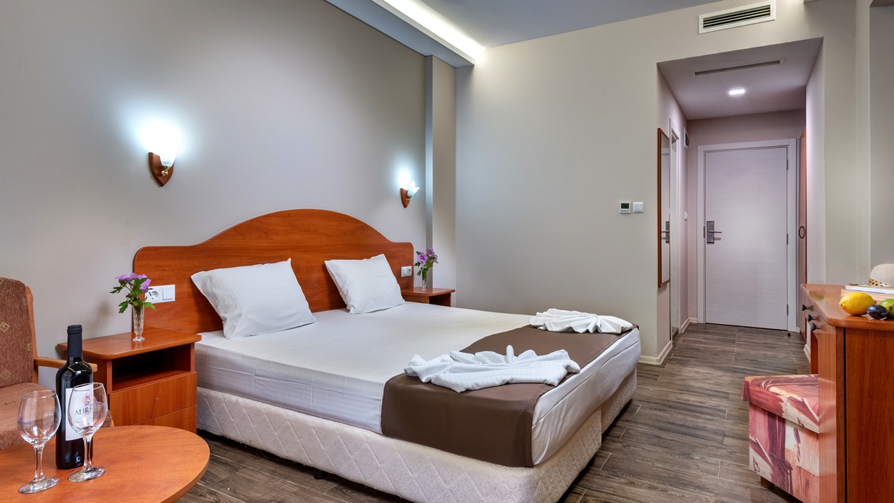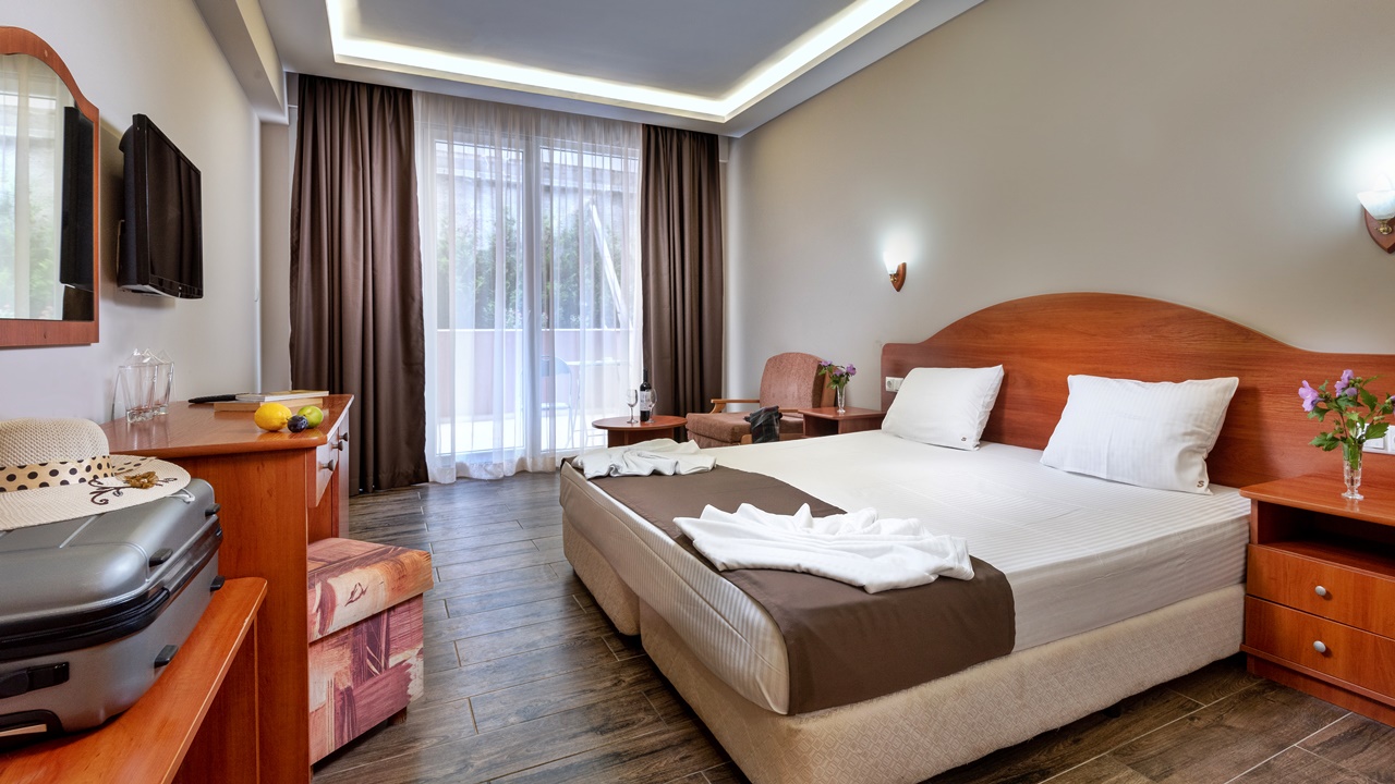 - Двойните стаи и двойните стаи с изглед море са обзаведени със спалня или две отделни легла. В повечето от тях има възможност за поставяне на допълнително легло за възрастен или детска кошарка за най-малките гости.