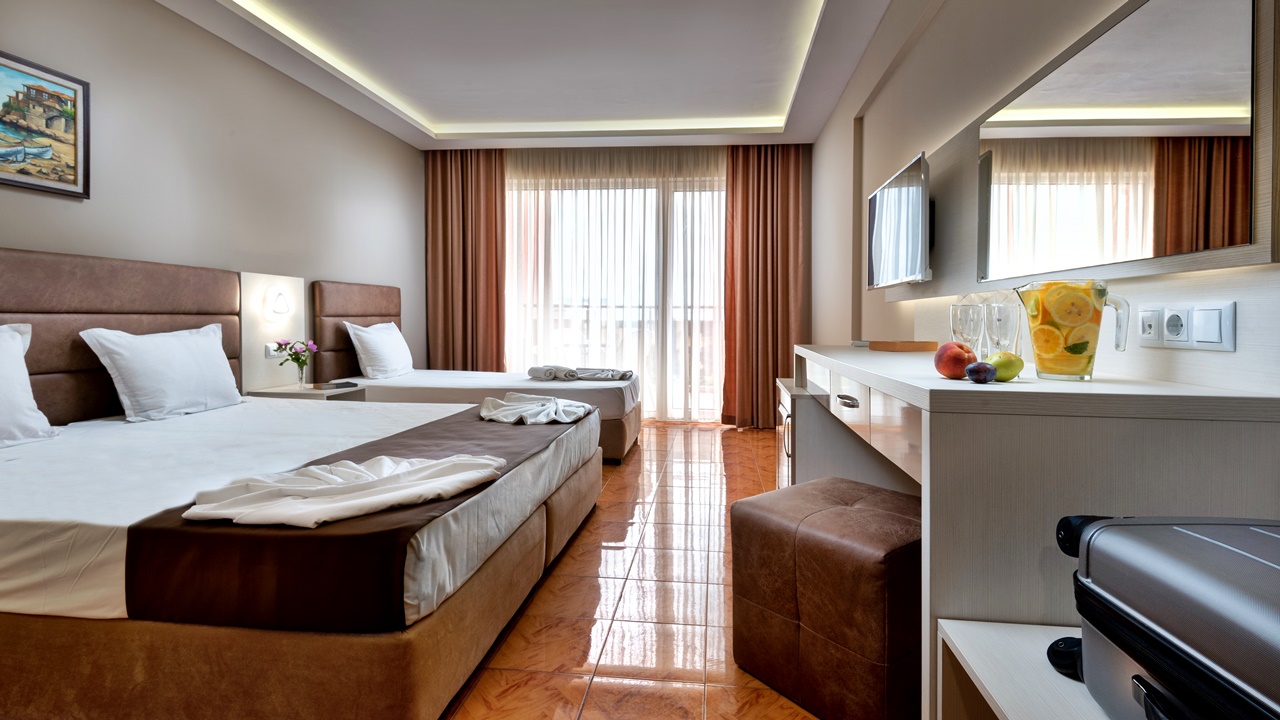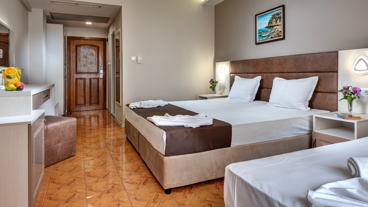 - Тройните стаи (луксозни, с изглед към морето или тройни със страничен изглед) са обзаведени със спалня и единично легло. В стаите със страничен изглед има възможност за поставяне на детска кошарка. Тройните стаи разполагат с тераси, сешоар, LED телевизор, цифрова и кабелна телевизия, безжичен интернет достъп, телефон с директно набиране, климатизация с контрол в стаята, мини бар (хладилник), всички бани са с душ кабини