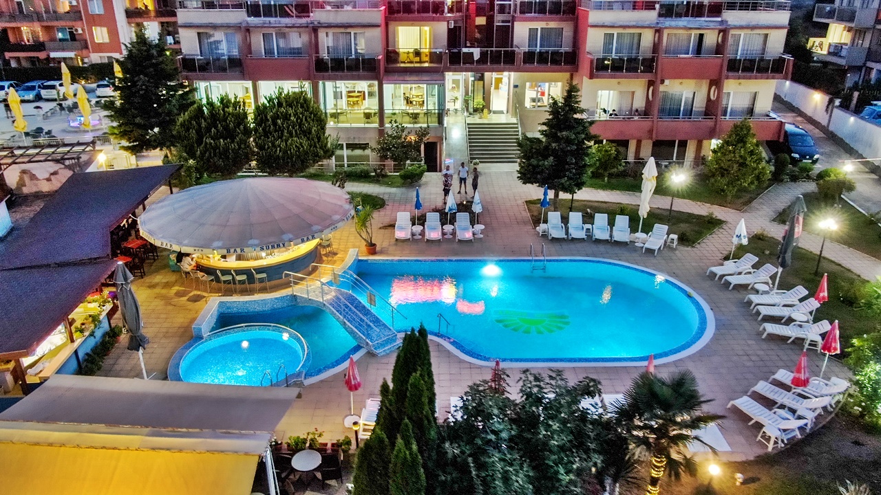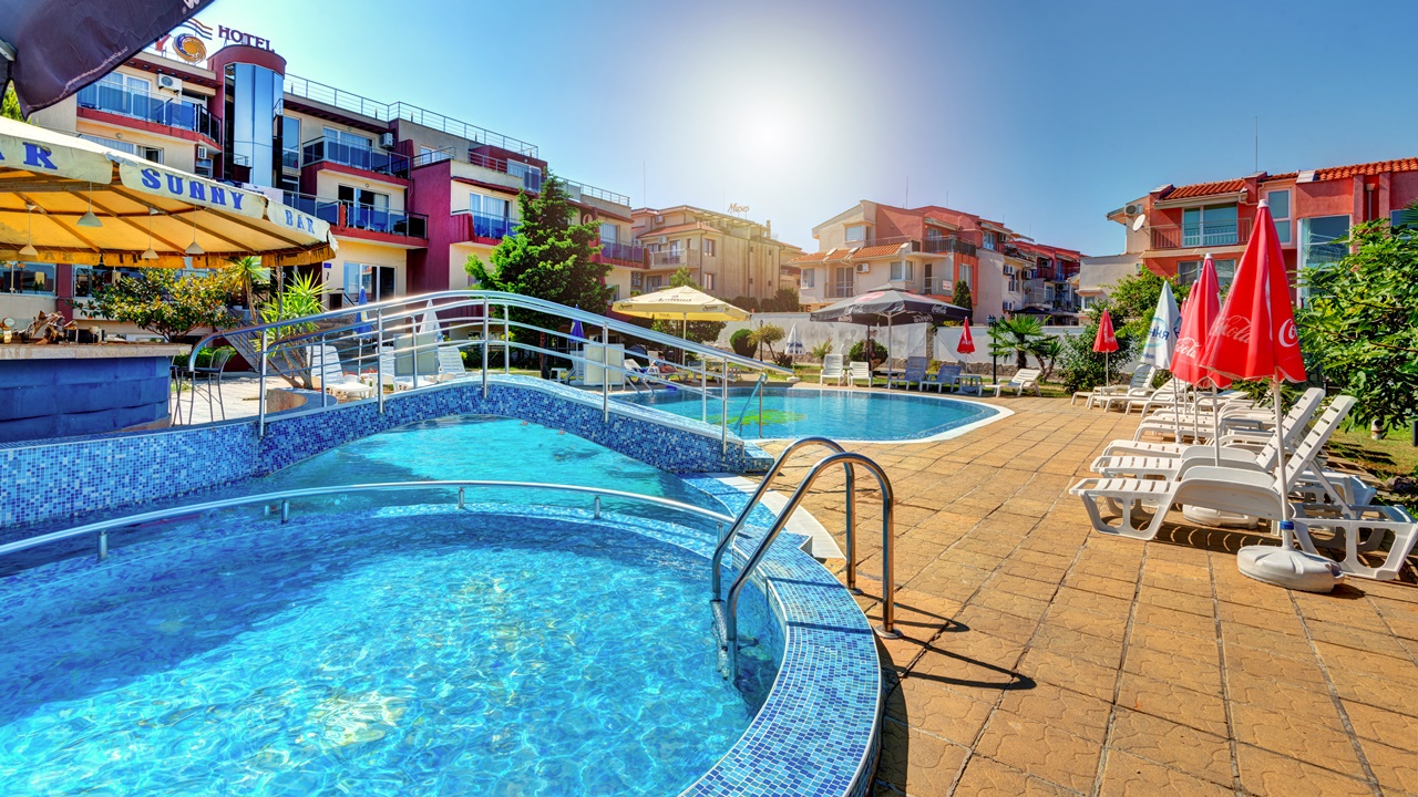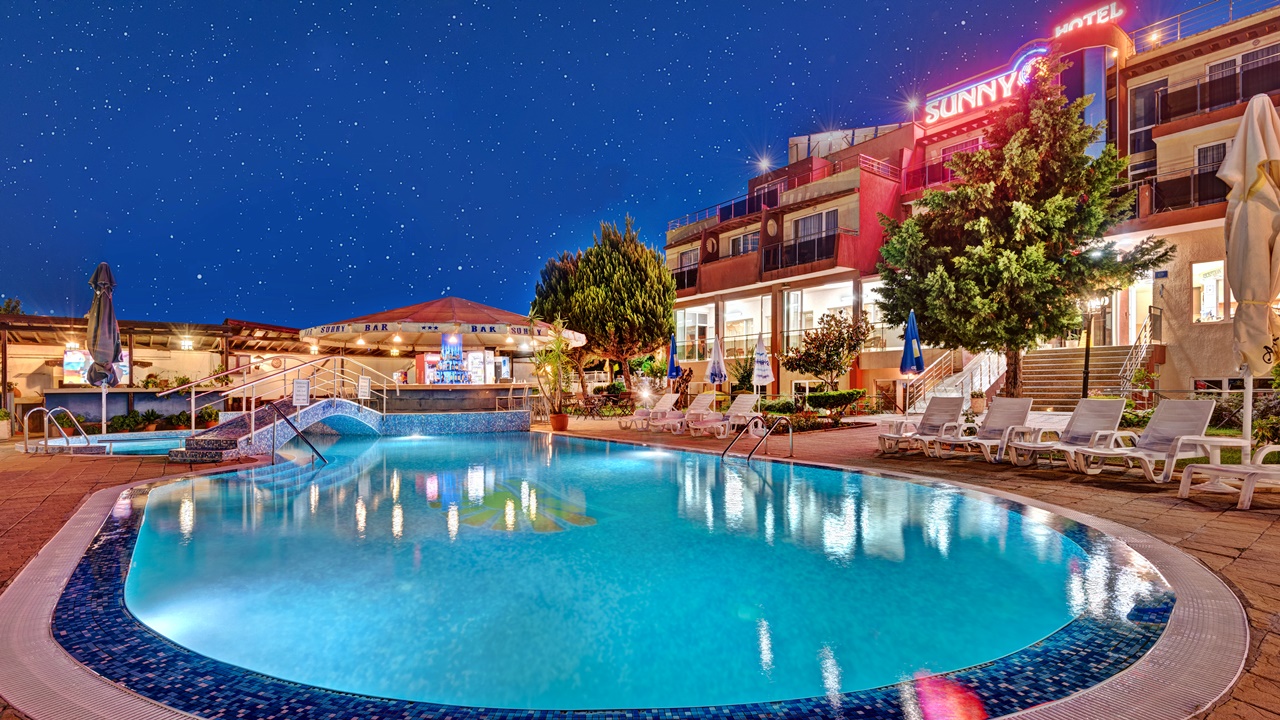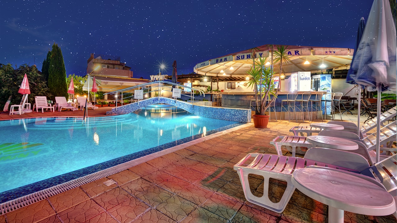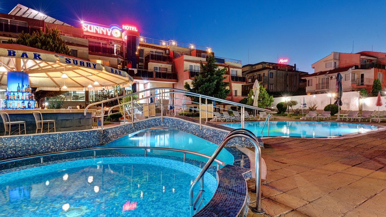 Хотел Съни, Созопол, е разположен само на 50 метра от плажната ивица и в непосредствена близост до централната търговска улиц на Новия град в Созопол. Хотелът предлага просторни, уютни и напълно оборудвани помещения, подходящи за една перфектна лятна почивка. Всички помещения са с балкон, климатик, голям телевизор и др. Хотел Съни разполага с детски кът, голям басейн за деца и възрастни, бар край басейна, сауна, фитнес, тенис на маса, масажи и др. Възползвайте се и си подарете една незабрвима почивка до морския бряг!