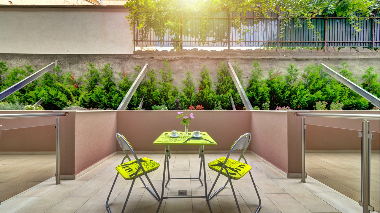 - Двойните стаи с английски двор са обзаведени със спалня или отделни легла. В повечето от тях има възможност за поставяне на разтегателен фотьойл или детска кошарка. Намират се на партерен етаж с английски двор (излаз от балкона към двора на хотела). Стаите разполагат с тераси, сешоар, LED телевизор, цифрова и кабелна телевизия, безжичен интернет достъп, телефон с директно набиране, климатизация с контрол в стаята, мини бар (хладилник), всички бани са с душ кабини.